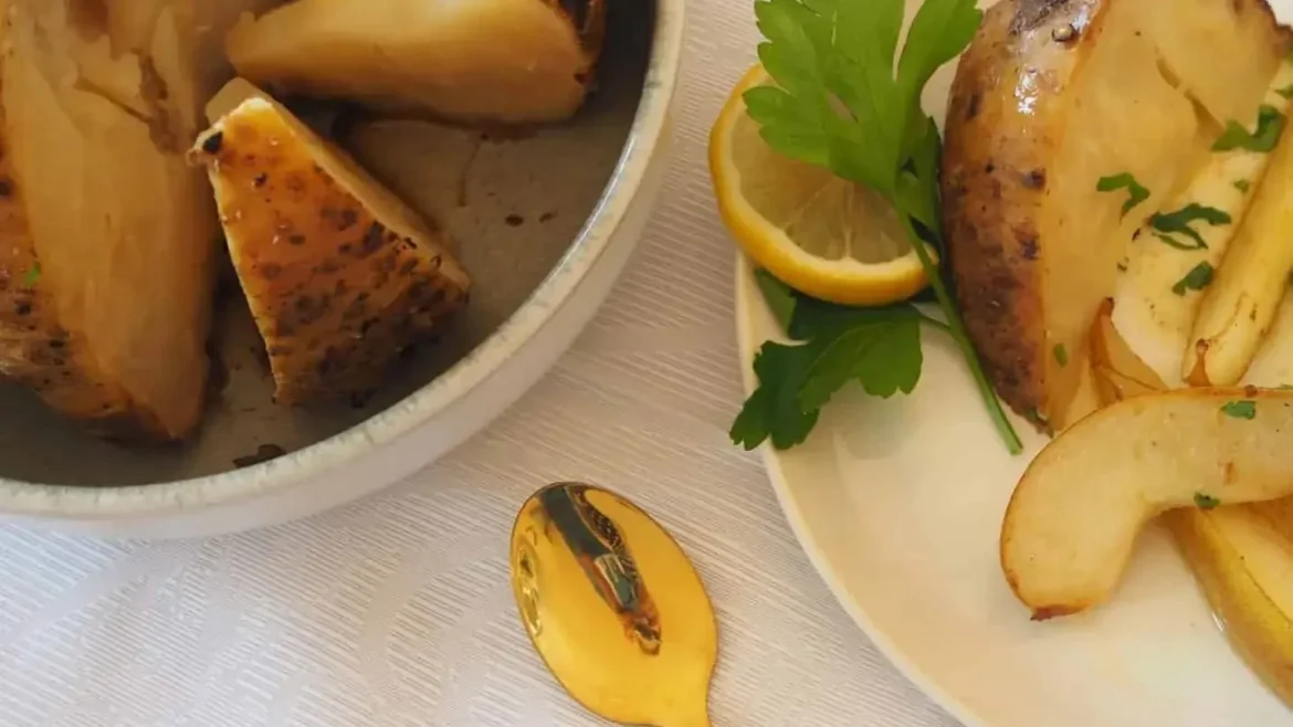 - Pečený celer nakrájejte na plátky nebo klínky a podávejte s pyré a hruškami.