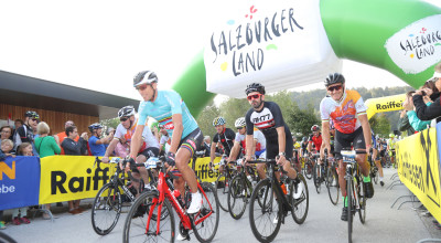 © SalzburgerLand Tourismus – Impressionen von der Eddy Merckx Classic Charity-Ausfahrt in der Fuschlseeregion. Im Hintergrund der Fuschlsee.