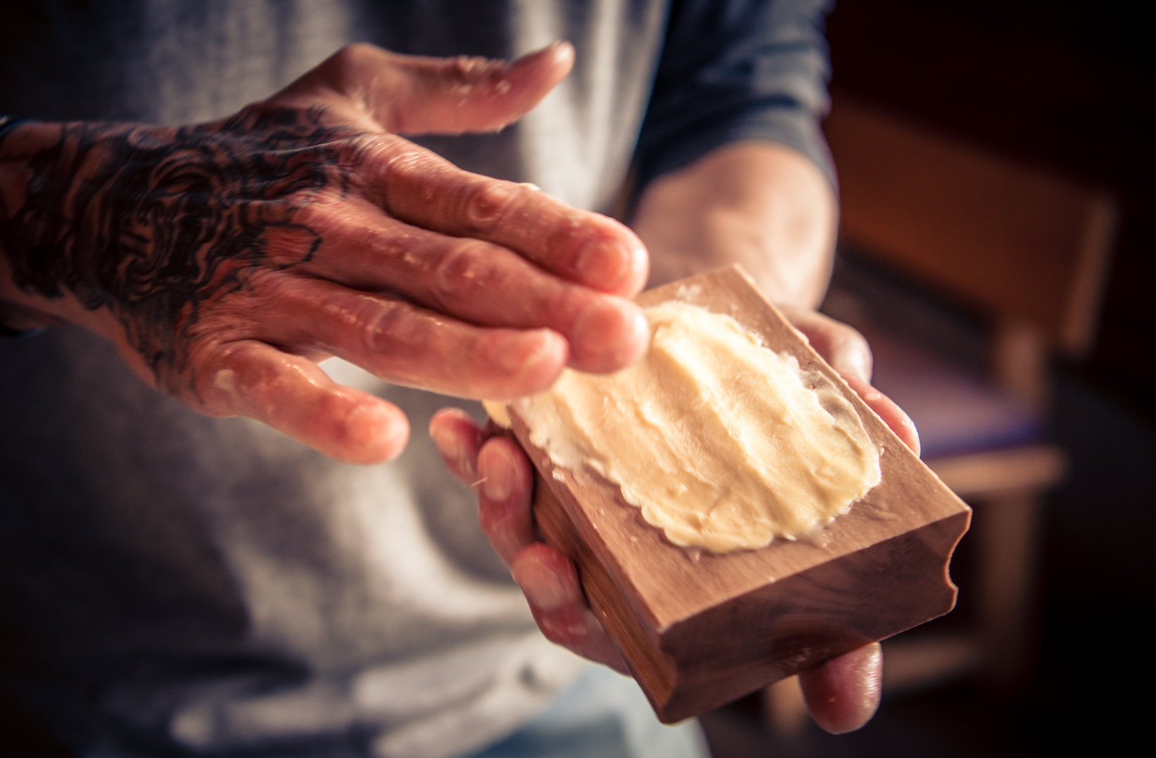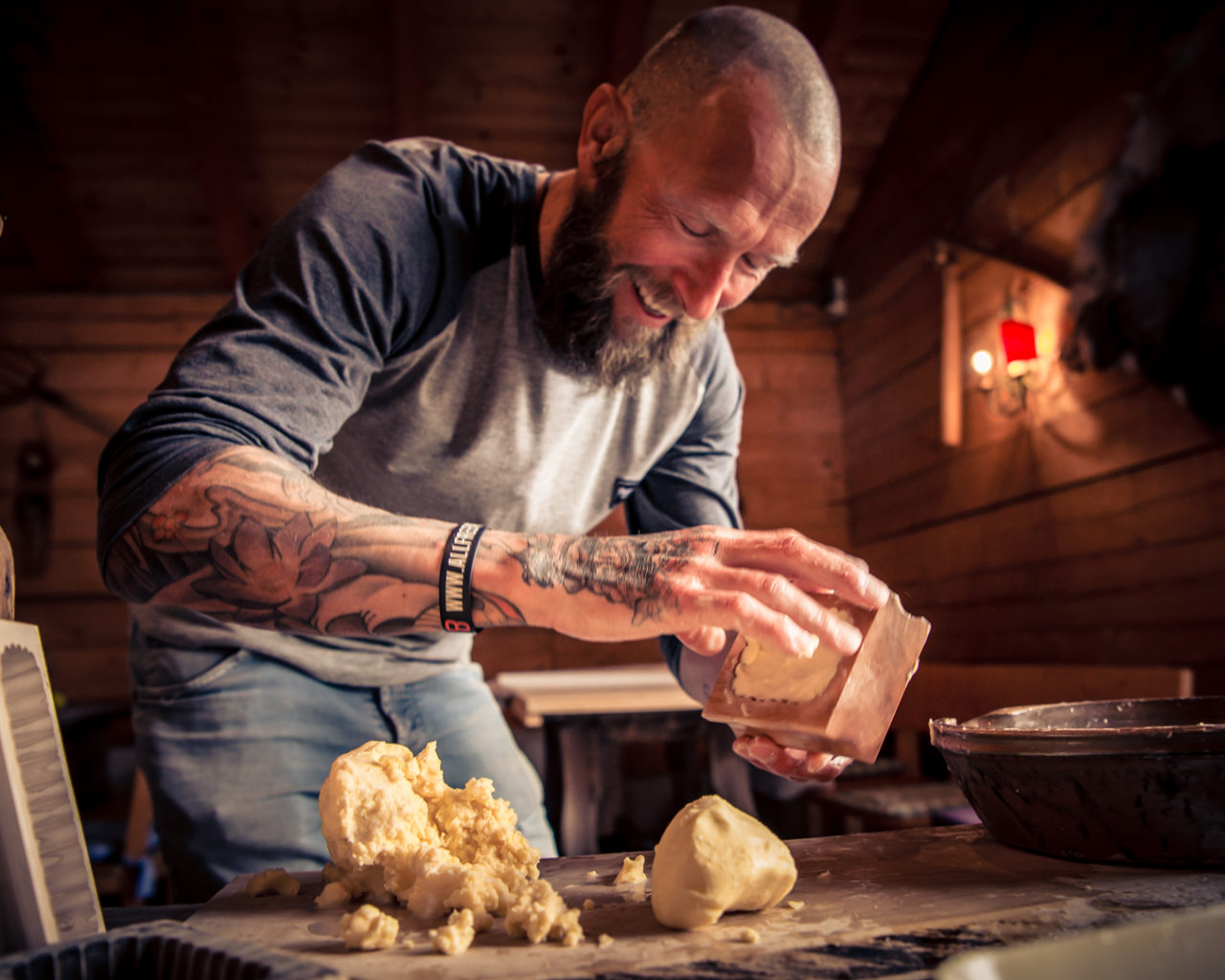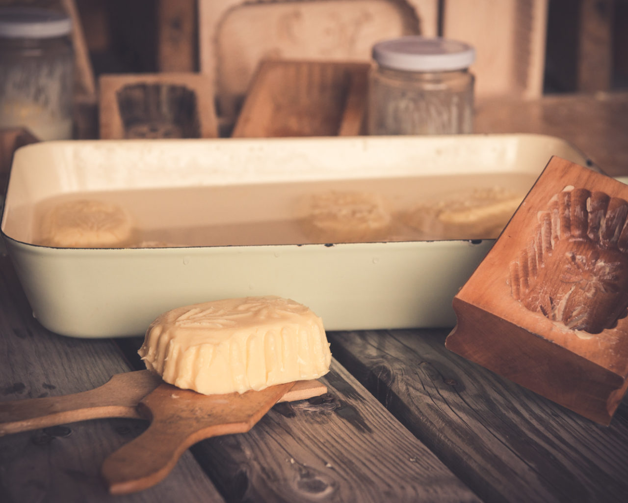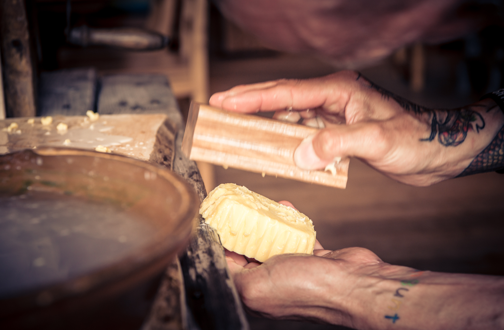 „Die Butter muss nun portionsweise im kalten Wasser gewaschen, fest zwischen den Händen geklatscht und ausgedrückt werden, um sie von der Buttermilch zu befreien. Denn je weniger Buttermilch in der Butter verbleibt, desto länger bleibt sie frisch. Und dabei müssen wir schnell arbeiten, damit die Butter beim Eindrücken in die Model nicht zu warm wird.“ Sasch und Oli haben an dieser Aufgabe sichtlich Spaß und es wird gewaschen, geklatscht und die Butter mit viel Gefühl in die kleinen, kunstvoll geschnitzten Holzformen – die Model – gedrückt. Dann muss die gefüllte Model an den Seiten hart an die Tischkante geklopft und umgedreht werden, um die nun fein verzierte Butter wieder aus der Form zu bekommen.