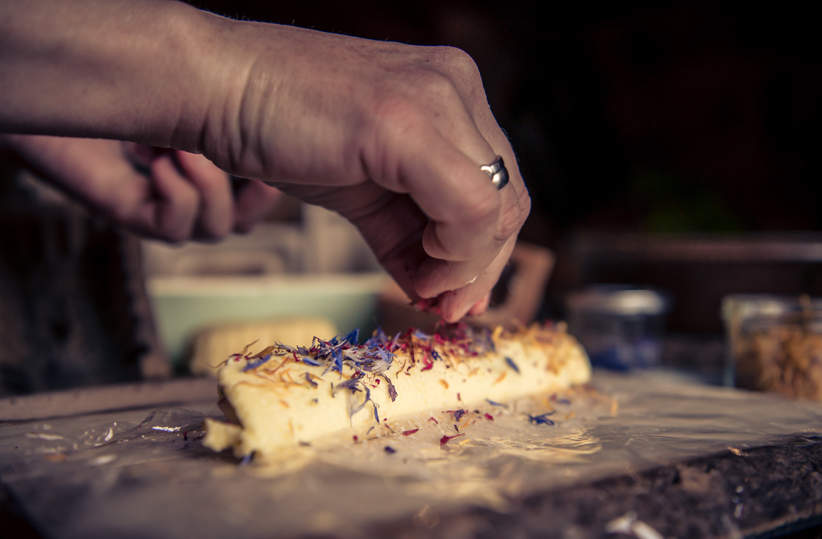 „Läuft ja wie geschmiert!“, freut sich das junge Pärchen lachend, als nach ein paar Versuchen dann endlich ein perfekter Butter-Riegel aus der Holzform in ihre Hände fällt. Stolz und fast ehrfurchtsvoll legen sie die Butter sachte in kaltes Wasser. Edith walzt inzwischen die restliche Butter flach und rollt sie mit etwas Salz und getrockneten Blüten zu einer dekorativen Butterrolle. „Selbermachen steigert die Wertigkeit des Produktes. Da schmeckt es gleich doppelt so gut“, schwärmen die Alm-Novizen als sie genüsslich in ihr Butterbrot beißen. „Wie funktioniert das dann eigentlich mit dem Käse?“, wollen sie neugierig wissen. Die beiden Bäuerinnen lachen und zwinkern sich zu – mit der beim Buttern gezeigten Leidenschaft trauen sie den beiden die Mission „Sasch und Oli gehen auf die Alm“ zu. Doch bis dahin warten noch einige Missionen auf die beiden – erstmal wollen sie von Melanie das Melken lernen…