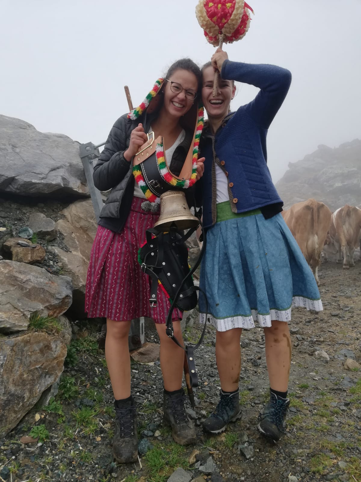 „Dreck ist mein MakeUp“, lacht die sympathische 23-Jährige und wischt sich die Reste eines Kuhfladens vom nackten Bein, das aus den Gummistiefeln ragt. Sie kommt gerade aus dem Stall, wo sie im Morgengrauen das Melken der zehn Milchkühe erledigt hat. „Es ist ungeschriebenes Almgesetz, dass die Kühe am Melkstand ihrer Verdauung freien Lauf lassen, da bekommt man schon mal etwas ab“, meint sie grinsend und verschwindet in die Alm, um kurz darauf frischgemacht, mit hochgebundenen Haaren und im feschen Trachtenrock wieder zu erscheinen. Kerstin ist eine der Sennerinnen auf der Litzelhofalm in Rauris und neben dem Versorgen des Almviehs – 10 Milchkühen rund um die Hütte und einigen Rindern auf der Hochalm – gehört auch das Kasen und die Bewirtung der Gäste zu ihren Aufgaben. Die ersten hungrigen Wanderer sitzen schon auf der sonnigen Terrasse und mit einem Strahlen nimmt die Regensburgerin ihre Bestellungen auf. Man könnte meinen, Kerstin hätte nie etwas anderes getan, doch betrat sie 2019 absolutes Neuland, als sie beschloss, nach dem Abitur einen Sommer als Sennerin zu verbringen.