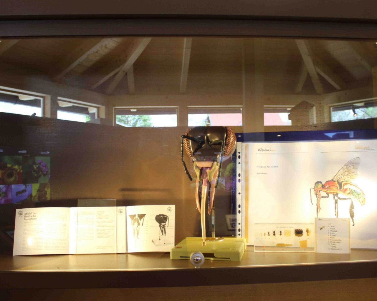 Das Highlight des Bienenerlebnisweges ist der Bienenpavillon: Da gibt es viele Informations-Tools, ein Bienenhaus mit Honigbienen-Schaukasten und Nisthilfen für Wildbienen und Hummeln („Bienenhotels“). Sehr interessant ist der Blick in einen Bienenstock. Mit Hilfe einer sogenannten Fotobeute kann das Leben der Immen beobachtet werden: Arbeiterinnen kommen vollgepackt mit Pollen in den Stock, andere ernähren die Königin und die junge Bienenbrut. „Damit die Bienen ihre Arbeit machen können, brauchen sie viele blühende Blumen, Bäume und Sträucher“, sagt ein Imker. Zudem Nektar und Pollen ohne Pestizide (Umweltgifte, die in der Landwirtschaft eingesetzt werden, um hohe Erträge zu erzielen). Pestizide sind Bienengifte. Sie werden weltweit für das Bienensterben mit verantwortlich gemacht. „In Gärten und auf Balkonen sollten wir Blumen blühen lassen und auf Pestizide unbedingt verzichten“, betont der Imker.
