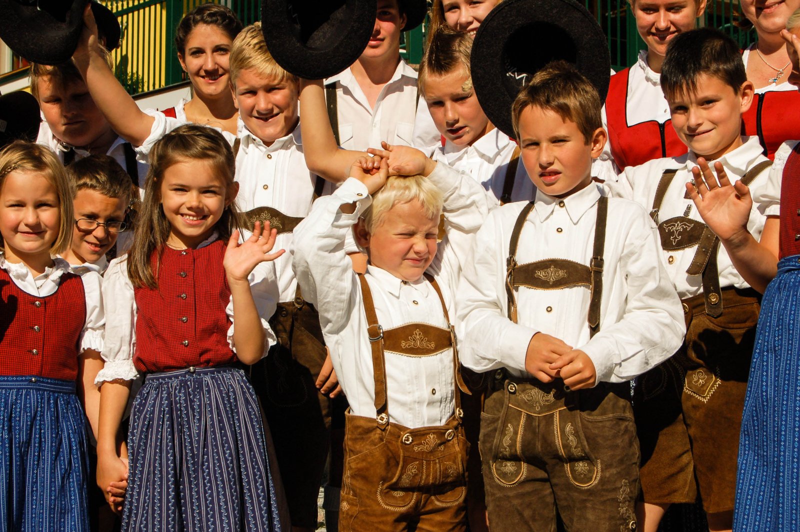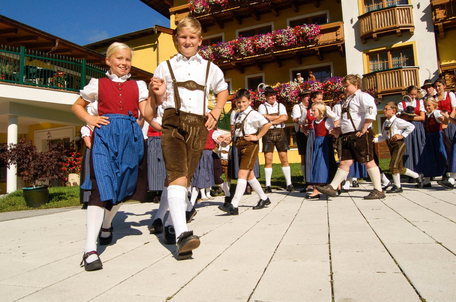 Rechts auf links und links auf links, vorne, hinten, überkreuz… Da kann man schon mal aus dem Takt kommen. Die kleinen Nachwuchs-Plattler stehen im Kreis auf dem Kirchenvorplatz der kleinen Gemeinde Viehhofen im Pinzgauer Glemmtal. Ihr Trainer ist Jochen Wörister, Obmann der Viehhofner Heimatgruppe und selbst Schuhplattler von Kindesbeinen an, und mit viel Geduld bringt er den Buben die traditionellen Plattler bei.