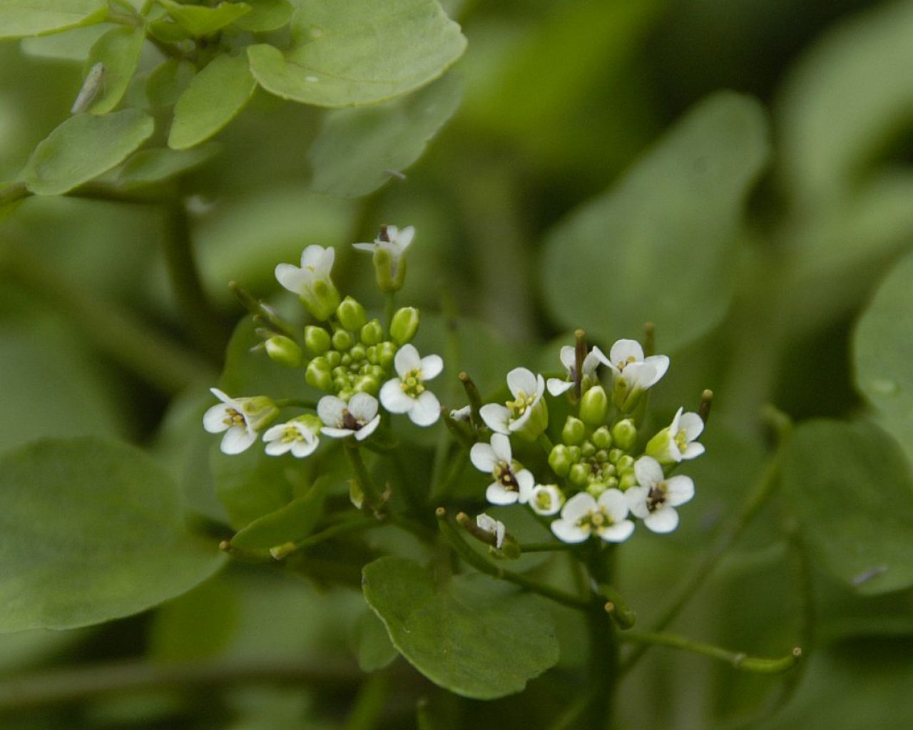 Um wachsen und gedeihen zu können, benötigt die Brunnenkresse sauberes Wasser. Biologen unterscheiden die echte Brunnenkresse Nasturtium officinale und die unechte Brunnenkresse oder das bittere Schaumkraut Cardamine amara voneinander. Für Laien sind diese Pflanzen kaum voneinander zu unterscheiden. Nur wer ganz genau hinsieht, erkennt während der Blütezeit den kleinen Unterschied. Bei der Brunnenkresse haben die traubigen Blütenstände gelbe Staubbeutel, die des bitteren Schaumkrautes violette. Der Stängel der bis zu 60 Zentimeter hohen Brunnenkresse sind hohl, die der Cardamine gefüllt. Und wie so oft im Pflanzenreich kommt bei verwandten Arten beides vor. Aber das macht nichts, denn beide Pflanzen haben ähnliche heilende und geschmackliche Eigenschaften. Eine Verwechslung ist daher ungefährlich.