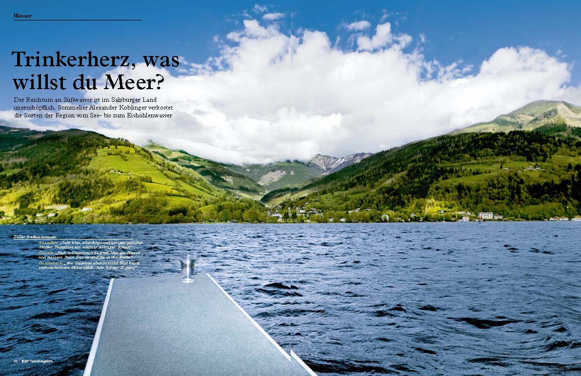 Die am Wasserfall entnommene Probe steht jetzt in einer sorgsam verschlossenen Glasflasche auf einem Tisch im Gourmetrestaurant Obauer. Daneben sechs weitere Sorten, gesammelt im ganzen Land: Leitungswasser aus einer Zisterne am Salzburger Mönchsberg, Brunnenwasser, ebenfalls aus der Landeshauptstadt; Wasser aus dem Zeller See, Gasteiner Mineralwasser direkt aus der Fabrik und Aufgetautes aus der Eisriesenwelt. Bis auf die letztgenannte aus einer Kalkhöhle im Tennengebirge gelten alle Sorten amtlich geprüft als Trinkwasser. Am Ende gibt es noch Kirschwasser vom Wolfgangsee. Alexander Koblinger, 2010 vom Fachmagazin „Rollin Pin“ zum Sommelier des Jahres gekürt, verkostet die sieben Proben und soll erraten, woher sie kommen: „Ich bin gespannt“, sagt er, „wir sind ja verwöhnt mit unseren Wässern.“