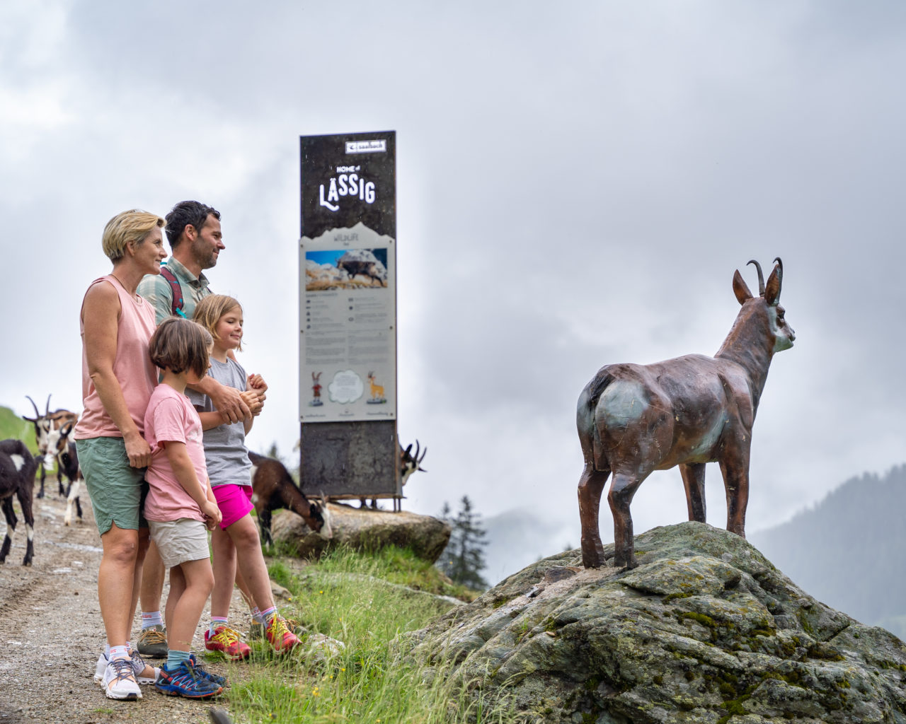 Nach Turmfalke, Feldhase und Alpenschneehuhn kommen wir zu den verspielten Gämsen – ach ja, wie weit springt so eine Gams eigentlich? Das wäre jetzt gut zu wissen, denn wer unterwegs das Wildlife-Quiz löst, den erwartet am Ende der Runde viel Ehre und eine ganz besondere Auszeichnung. Also: Zwei Meter, sechs oder gar 13? Wie gut, dass die informativen Schautafeln an jeder Station genau die Infos bereithalten, die es für des Rätsels Lösung braucht.