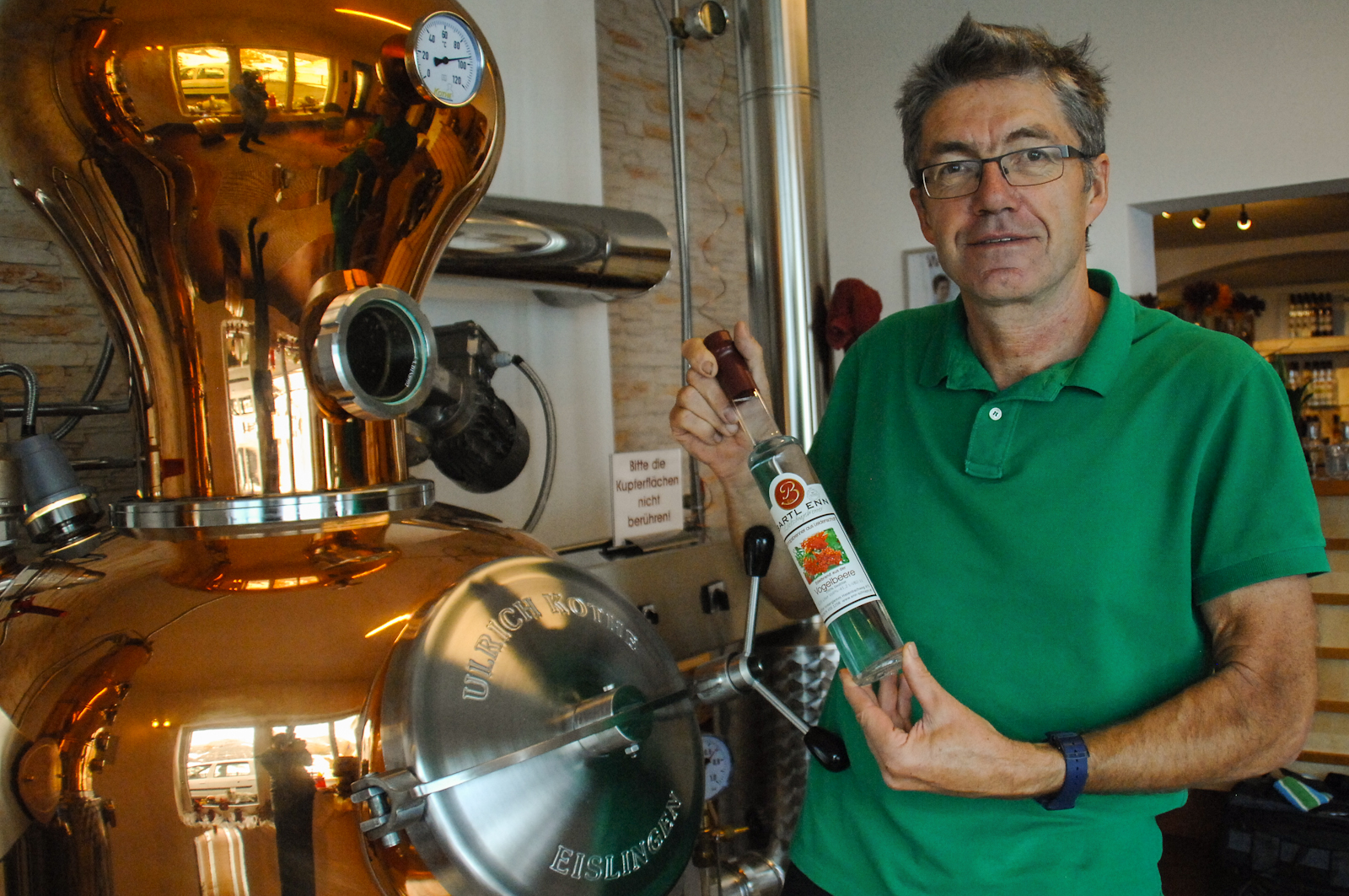 Ein satter warmer Geruch nach Alkohol liegt in der Luft, wenn die Glastüre aufschwingt und man das Innere der kleinen aber feinen Edelbrennerei von Bartl Enn, mitten im bekannten Wintersportort Saalbach Hinterglemm, betritt. Die alkoholgeschwängerte Luft kommt direkt aus dem kupfernen Brenngerät, das dekorativ im Eingangsbereich steht. Bartl ist mitten unter dem Brennvorgang und diesmal sind es Quitten, die tröpfchenweise ihre hochprozentige Seele in den Vorlauf-Behälter träufeln.