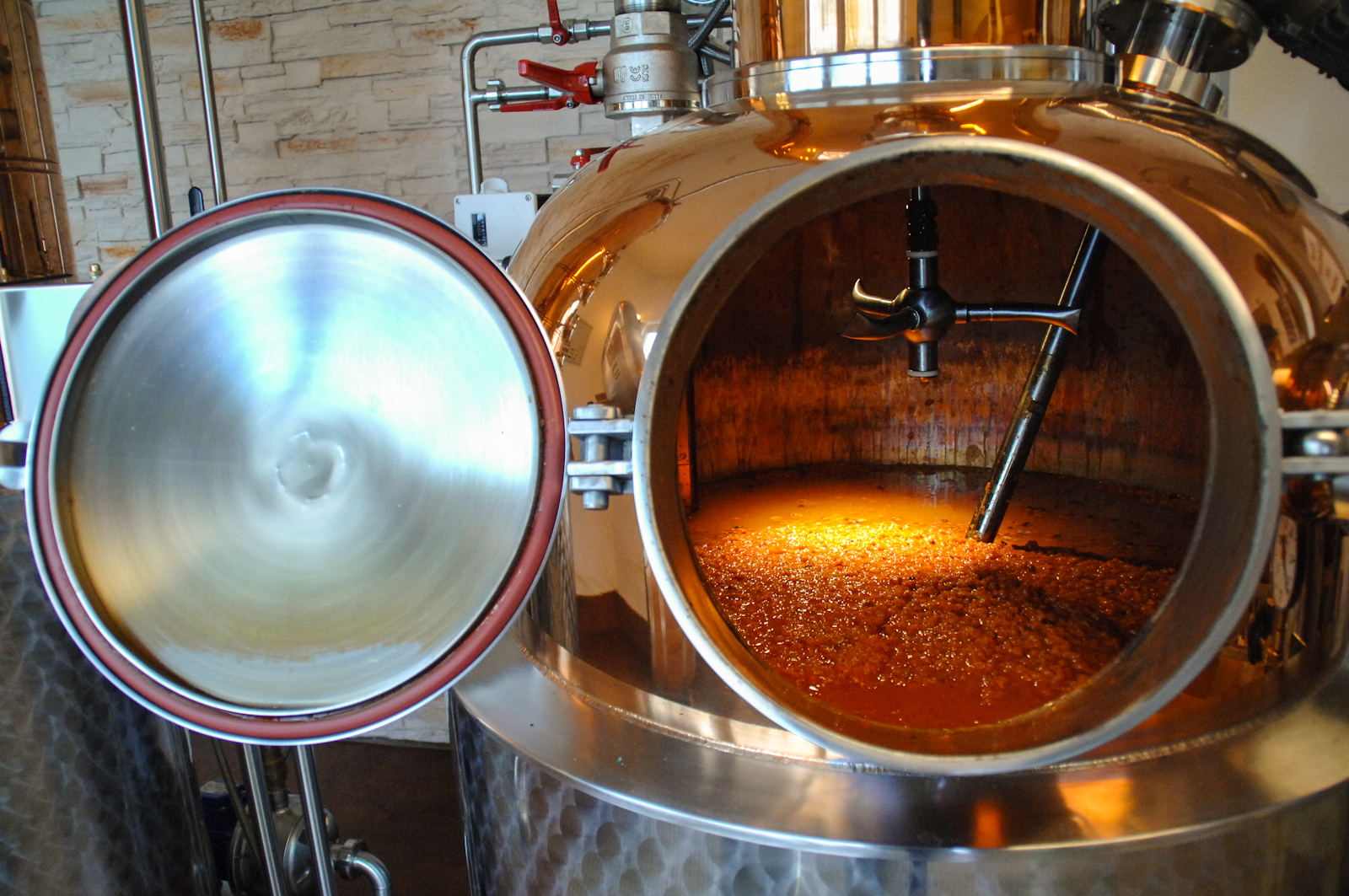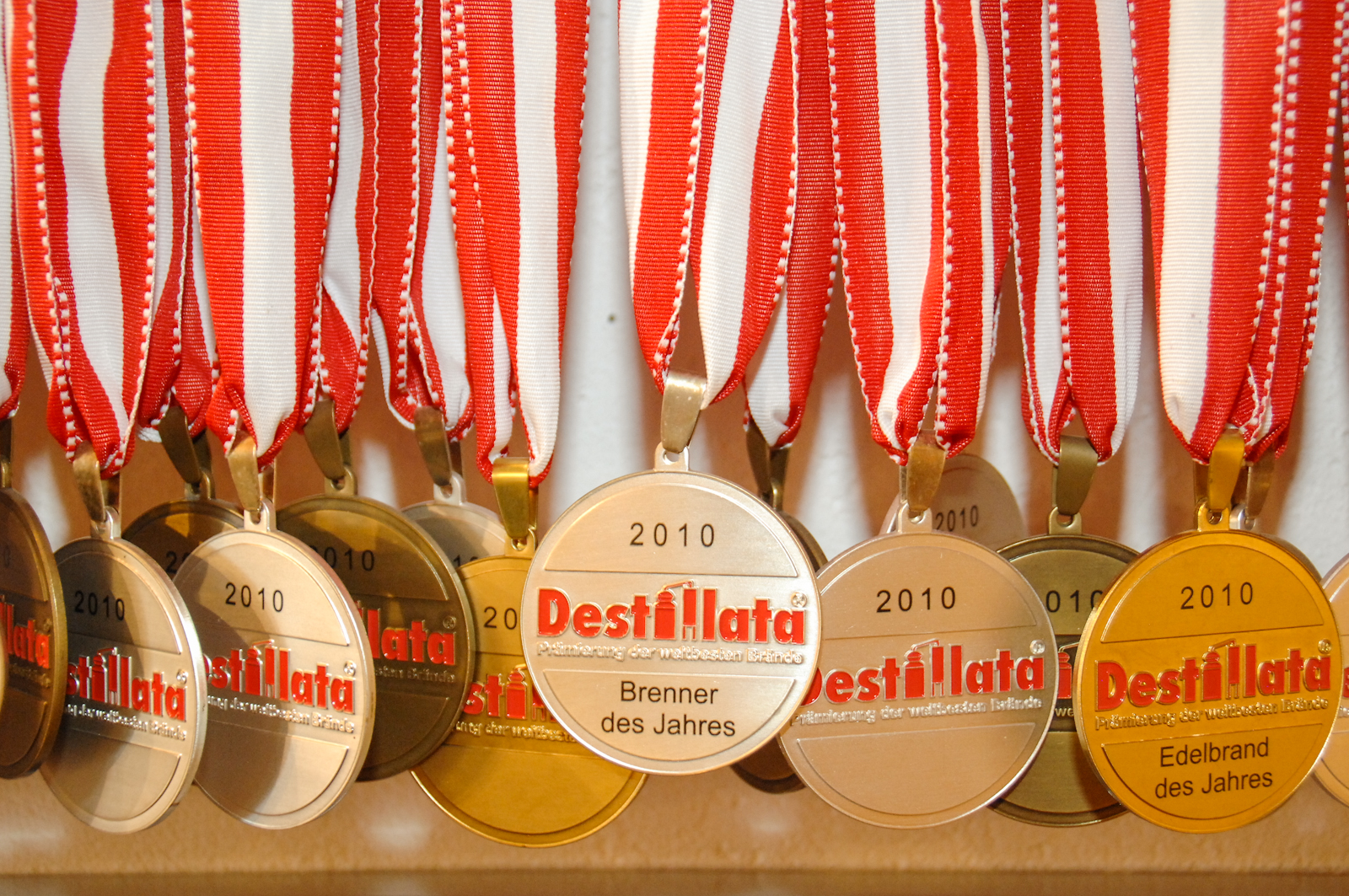 Mittlerweile arbeiten Bartl und seine Frau Monika vollzeit in der Brennerei und die Auszeichnungen und über 200 Medaillen bedecken schon eine ganze Wand. Bartl, der auch seit vielen Jahren Mitgliedsbetrieb der ViaCulinaria des SalzburgerLands ist, blickt stolz auf die vielen Prämierungen und erklärt: „Diese Erfolge bei internationalen Schnapspräsentationen bestätigen uns immer wieder, dass wir auf dem richtigen Weg sind, hochwertige Produkte herzustellen.“ Alle Früchte sind handverlesen, gereinigt und nur die beste Qualität wird für die Schnäpse eingemaischt. Beim Gären wird der Zucker der Früchte in Alkohol umgewandelt. Die Maische holt Bartl aus den silbernen Gärtanks und füllt sie in den Brennkessel. Während der Kessel nun bei rund 80 ° C auf Betriebstemperatur ist, beobachte ich durch das Glasfenster wie die Maische im Inneren der Brennblase vom Rührwerk durchgemischt wird und munter blubbert. Durch den Destillationsvorgang wird jetzt der Alkohol aus der Maische geholt. In der Kolonne, ein Turm mit Glockenböden, wird der Alkoholdampf etwas abgekühlt, dabei kondensieren Alkohole mit hoher Siedetemperatur und bleiben dadurch im Brenngerät. Nur Alkohol mit einem Siedepunkt bis 78 Grad gelangen als Dampf in den Kühler und verflüssigen sich dort. Und schon tröpfelt es aus dem Rohr.