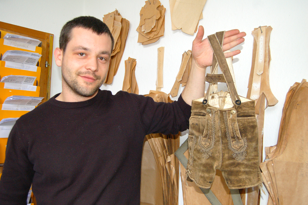 Schon als Kind hat er es geliebt, bei seinem Vater in der Werkstatt zu stehen, ihm zuzusehen und zu Basteln. Die Lederne war auch für ihn immer mit dabei: „Als Kind war sie ein Muss, als Jugendlicher habe ich sie dann abgelehnt und mich im Skaterstil gekleidet. Doch dann bin ich schnell wieder auf den Geschmack gekommen und mit 16 hab ich in der Lehre bei meinem Vater die erste Lederhose selbst gemacht. Heute gibt es für mich nichts Angenehmeres als meine Lederne,“ sagt er und schaut auf seine eigene Lederhose. Lässig und edel sieht sie aus, die lange Lederhose im Stil einer Levis geschnitten – keine Schnörkel und doch ein Stück Tradition.