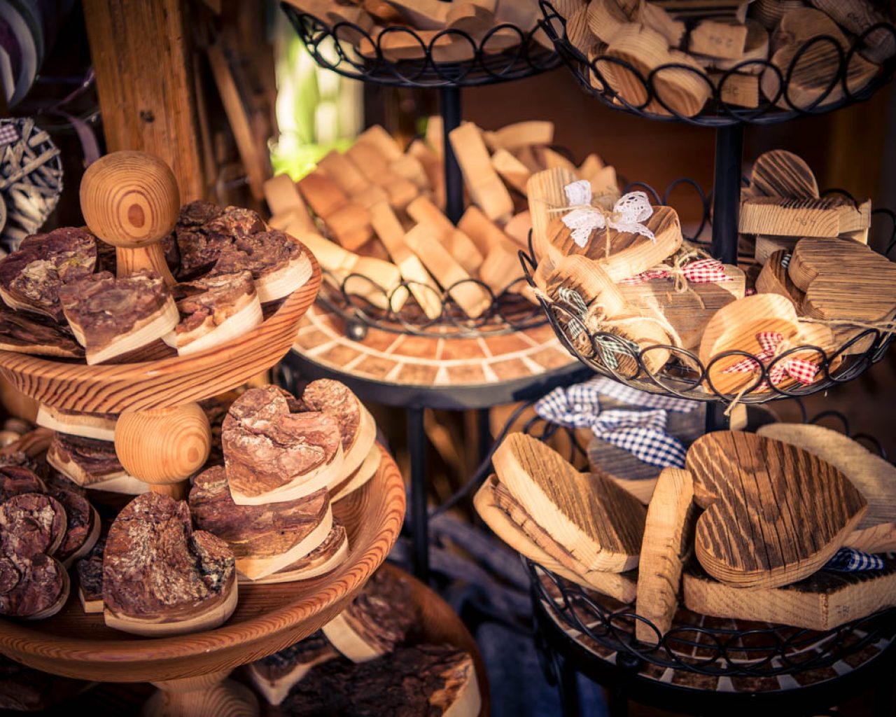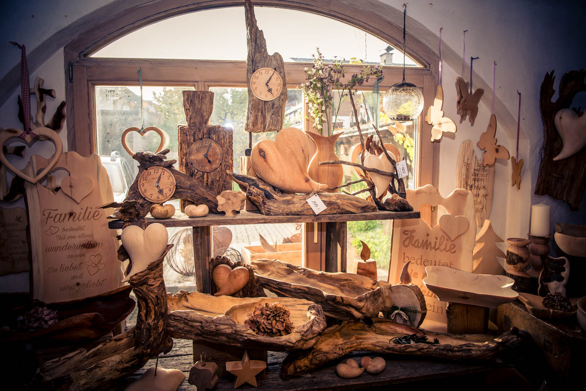 Mitten in einer kleinen Siedlung, rund zwei Kilometer außerhalb des Ortsgebiets von Leogang, finde ich dank zahlreicher Holz-Wegweiser schnell zum Kreativ Laden von Elke und Christian. Bereits der Vorplatz des Ladens in ihrem Privathaus ist eine wahre Augenweide – Holz-Dekostücke, blühende Büsche in denen unzählige Bienen summen, bunter Krimskrams und dahinter ein grüner Dschungel. Und beim Eintreten in den kleinen Laden umfängt mich der Duft nach Zirbenholz wie eine warme Umarmung. Hier ist jeder richtig, der Holz liebt und außergewöhnliche Geschenke sucht!