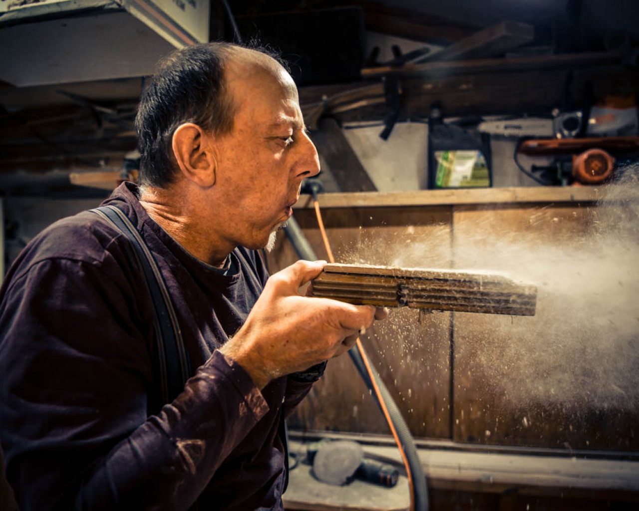 Elke und Christian sind ein gut eingespieltes Team. Eigentlich arbeitete Christian ja bis vor wenigen Jahren als Maler und Elke war Verkäuferin für Geschirr und Porzellan. Doch gemeinsam steckten sie sich mit ihren kreativen Ideen an und vor über zehn Jahren eröffneten sie den kleinen Laden im Erdgeschoß ihres Hauses. Christian begann schon vor langer Zeit mit dem Restaurieren von antiken Holztruhen und Kästen. So richtete er sich nach und nach eine kleine Werkstatt ein, und seine Liebe zum Arbeiten mit Holz war voll entflammt. Vor drei Jahren stellte er seinen Malerpinsel in die Ecke, um Vollzeit als Kunsthandwerker zu arbeiten. Seitdem werkelt er Tag für Tag in der kleinen gemütlichen Werkstatt im Garten, und ein kreativer Einfall jagt den anderen. „Meist habe ich während dem Erstellen eines Kunstwerks schon die Idee für das nächste Projekt. Das wird dann nur schnell aufskizziert für später. Abfall gibt es bei uns kaum – sogar die Zirbenholzspäne finden Verwendung. Holz ist ein wertvoller Rohstoff und wir verarbeiten auch die Reste zu kleinen Souvenirs.