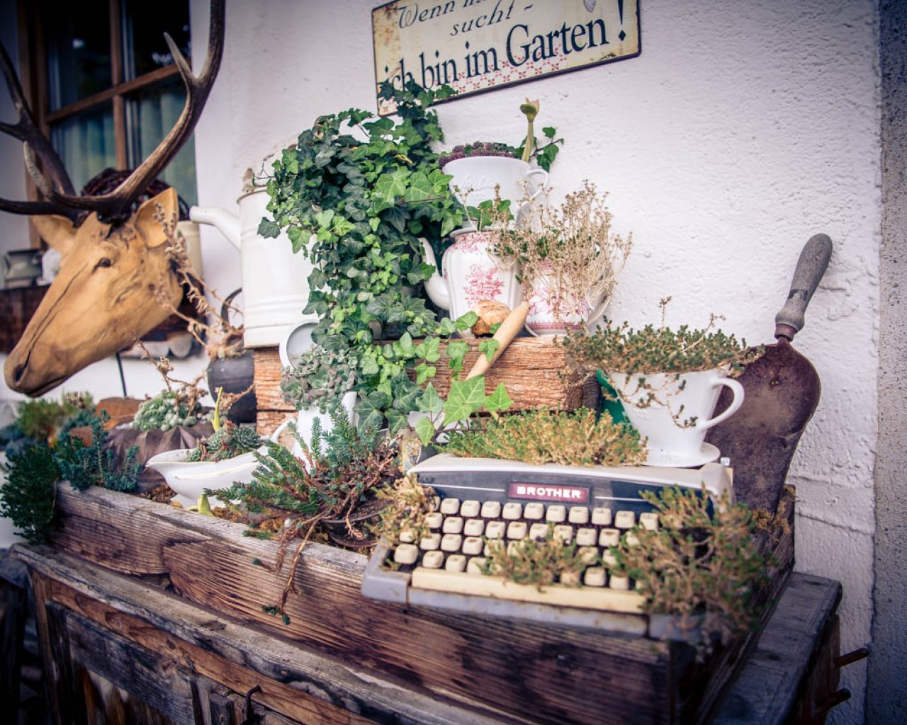 Wenn die beiden gerade nicht im Kreativ Laden oder der Werkstatt stehen, dann spazieren sie mit dem Hund durch Saalfelden Leogang – immer mit einem wachen Auge auf Schwemmholz, Wurzeln und alte Holzteile. Denn meist landet das Spaziergangs-Fundstück sofort in der Werkstatt. Elke verwendet ihre Freizeit gern zum Gestalten des Gartens. Wie ein grüner Dschungel ist die kleine Fläche angelegt – mit Karpfenteich, Hühnerstall und unzähligen Pflanzen und Dekostücken. Ich komme aus dem Staunen nicht heraus und entdecke immer wieder neue Details. Elke lacht: „Darum gebe ich zweimal in der Woche Gartenführungen. Da erkläre ich wie und warum der Garten entstanden ist. Er ist unser kleines Paradies hinterm Haus und er ist wie ein Kunstwerk: eigentlich immer im Entstehen und nie ganz fertig. Wie im künstlerischen Gestalten bin ich auch im Garten für die kleinen Details zuständig, Christian denkt meist riesengroß und in der Mitte treffen wir uns dann.“ Werkstatt, Laden, Garten – ein Besuch bei den Riedlsperger’s in Hirnreit in Leogang ist nicht nur Shoppen von edlen Geschenken, sondern ein echtes Abenteuer für kreative Geister.
