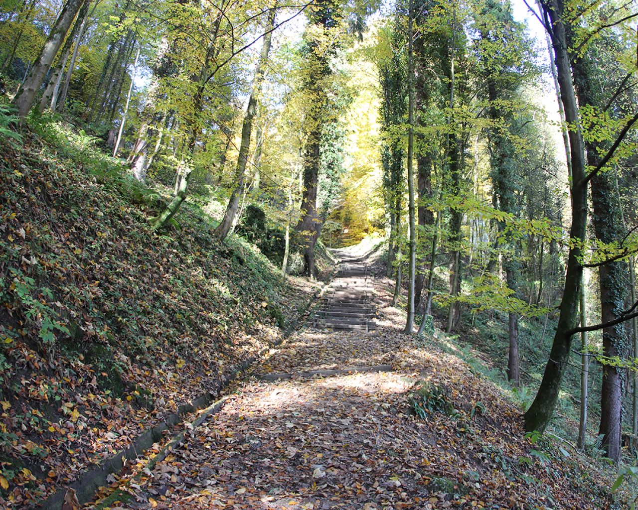 Das Steintheater ist sowohl über Treppen als auch über einen Waldweg zu erreichen. Hinweisschilder im Schlosspark weisen den Weg.