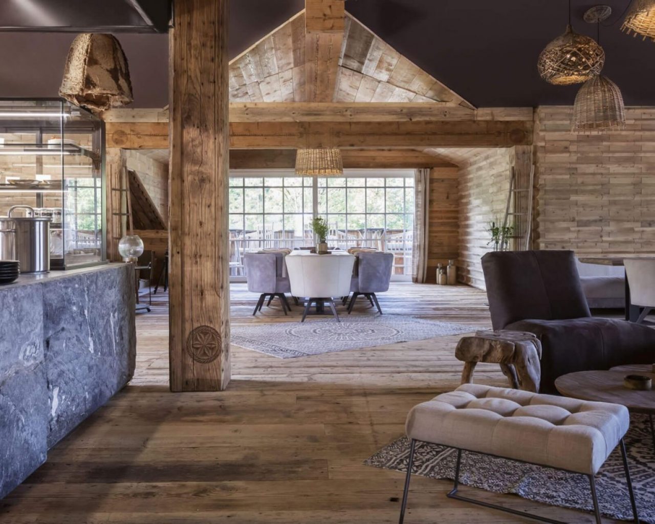Vermeintliche Widersprüche vereinen sich und machen dieses Hotel erst zu dem, was es ist: etwas Außergewöhnliches. In architektonischer Hinsicht ist das Atrium, aus dem ein 100-jähriger Baum ragt, das Bindeglied zweier so unterschiedlicher Hausteile, wie sie nur „Sepp“ derart stilvoll und extravagant zu verschmelzen versteht. Die Fassadenverkleidung aus urigem Altholz wirkt deshalb so eindrucksvoll, weil daneben ein Glashaus im modernen Look einen scharfen Kontrast schafft. Apropos Holz: Altholz findet sich auch an den Wänden und bringt Behaglichkeit ins Haus, Barfußfreunde erfreuen sich am beheizten Holzboden in den Zimmern.