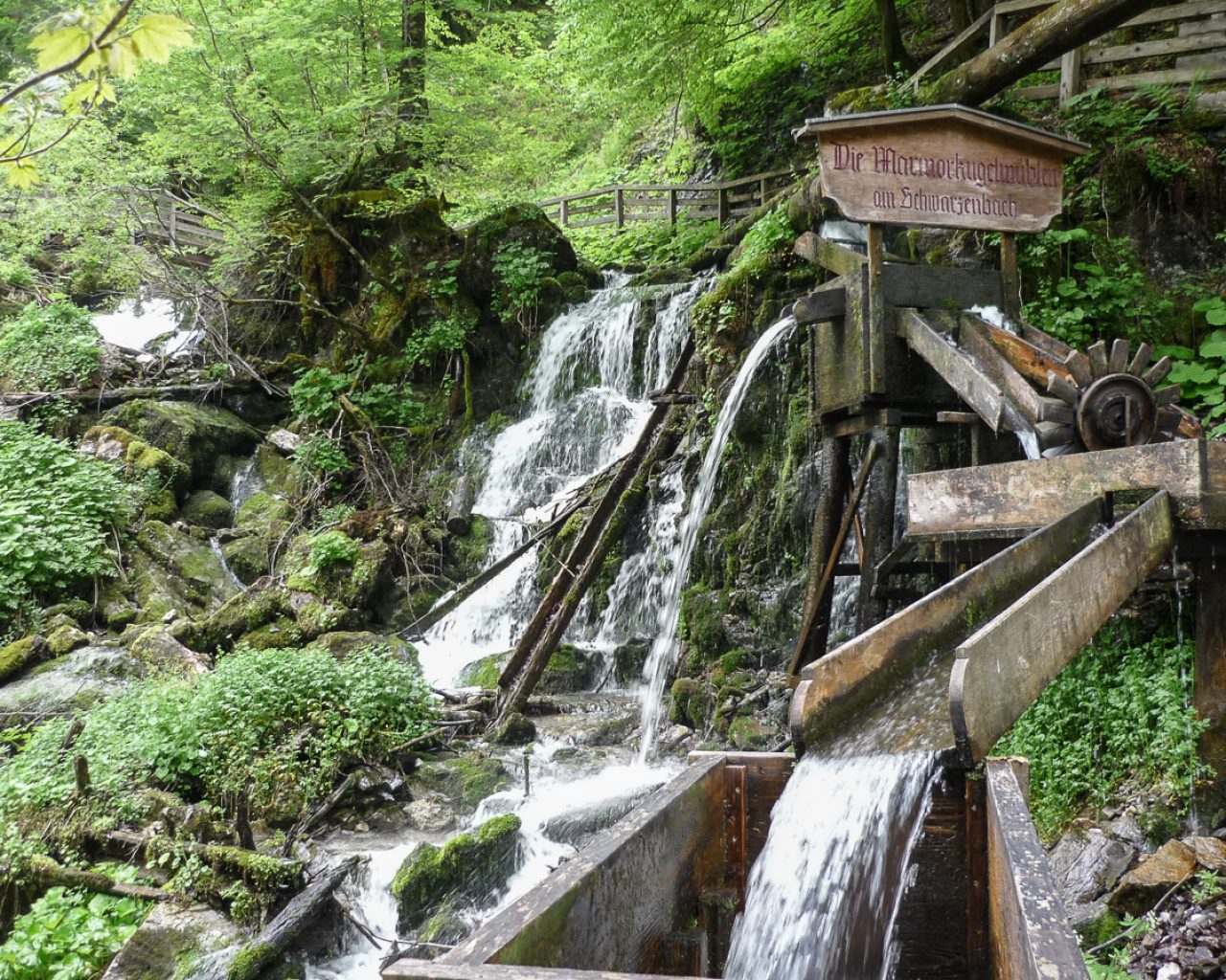Der Bach als Begleiter lädt immer wieder zum Pritscheln und Planschen ein. Da wird das Spazierengehen gleich kurzweiliger. Und schon nach kurzer Zeit ist die Mühle erreicht. Für müde kleine Wanderer ist hier der Endpunkt. Bei größeren Kinder wird jetzt erst der Entdeckergeist so richtig geweckt, denn hinter der Mühle geht es entlang des Wasserfalls hinauf. Woher das viele Wasser wohl kommt?