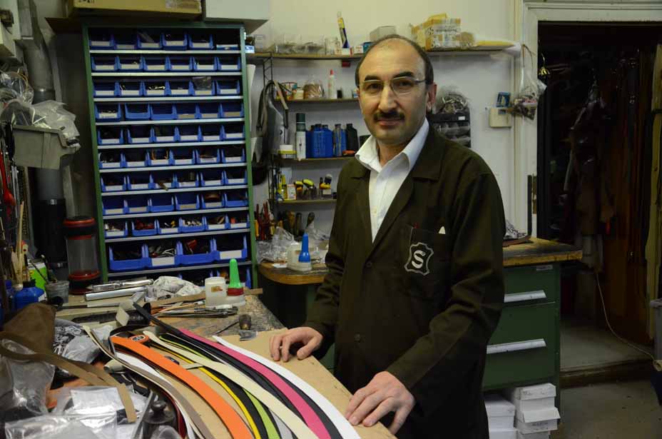 Battal Ordu bringt in der Werkstatt des Gürtelmachers Schliesselberger zwei Druckknöpfe auf einem schmalen Damengürtel an. Die Kundin wartet währenddessen im Geschäft. Sein Chef, Wolfgang Schliesselberger, sagt: „Bei Gürtel, die bei uns gekauft wurden, steht der Service an erster Stelle. Meist ist die Umarbeitung prompt oder in kürzester Zeit, kostenlos möglich.“