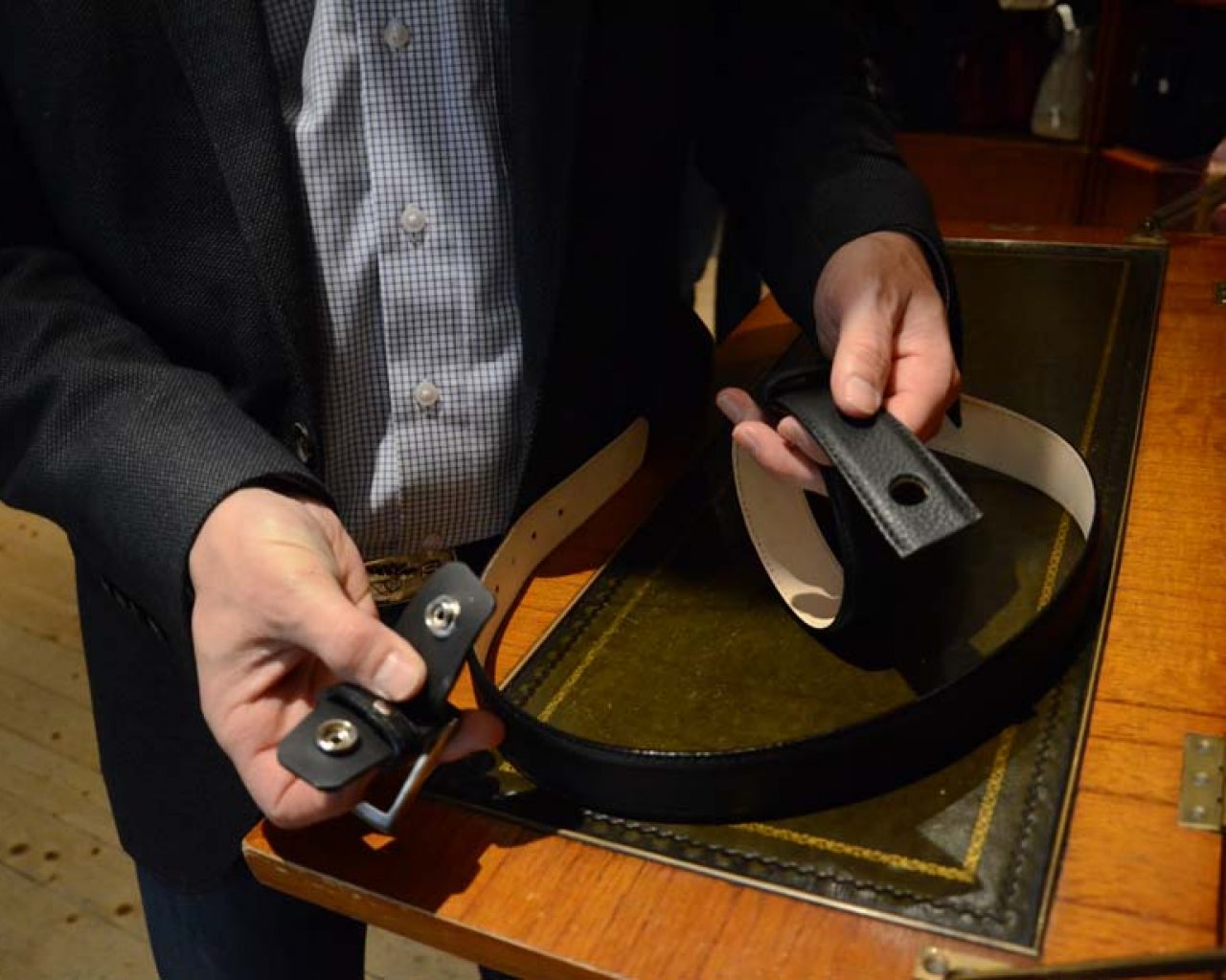 Für Vielflieger, hält der Experte Spezielles bereit: Einen Gürtel mit einer Schließe zum Abknipsen. Damit muss der Gürtel bei der Kontrolle nicht abgenommen werden. Verkäuferin Kathrin Parzer schwärmt vom „Softgürtel“: „ Er besteht aus drei Lagen feinem Kalbsleder. Daher ist er sehr weich und zugelastisch.“