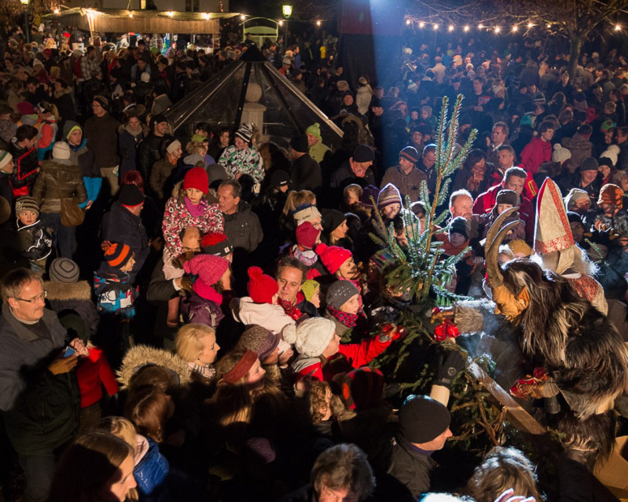 Der Einzug ist magisch und spannungsgeladen: angeführt vom Regenten Luzifer laufen rund 40 Krampusse mit Feuer, Rauch und Schwefel ein. Der Wegmacher „Wass“ erzählt die Geschichte dieser zotteligen Wesen aus der Unterwelt. Als Begleiter des Nikolaus wagen sie sich nicht von seiner Seite, bis er ihnen erlaubt die Schlimmen zu bestrafen. Über 2.500 Zuschauer, darunter hauptsächlich Familien mit Kindern, lauschen gespannt dem Bühnenspiel mit Nikolaus und Teufel.