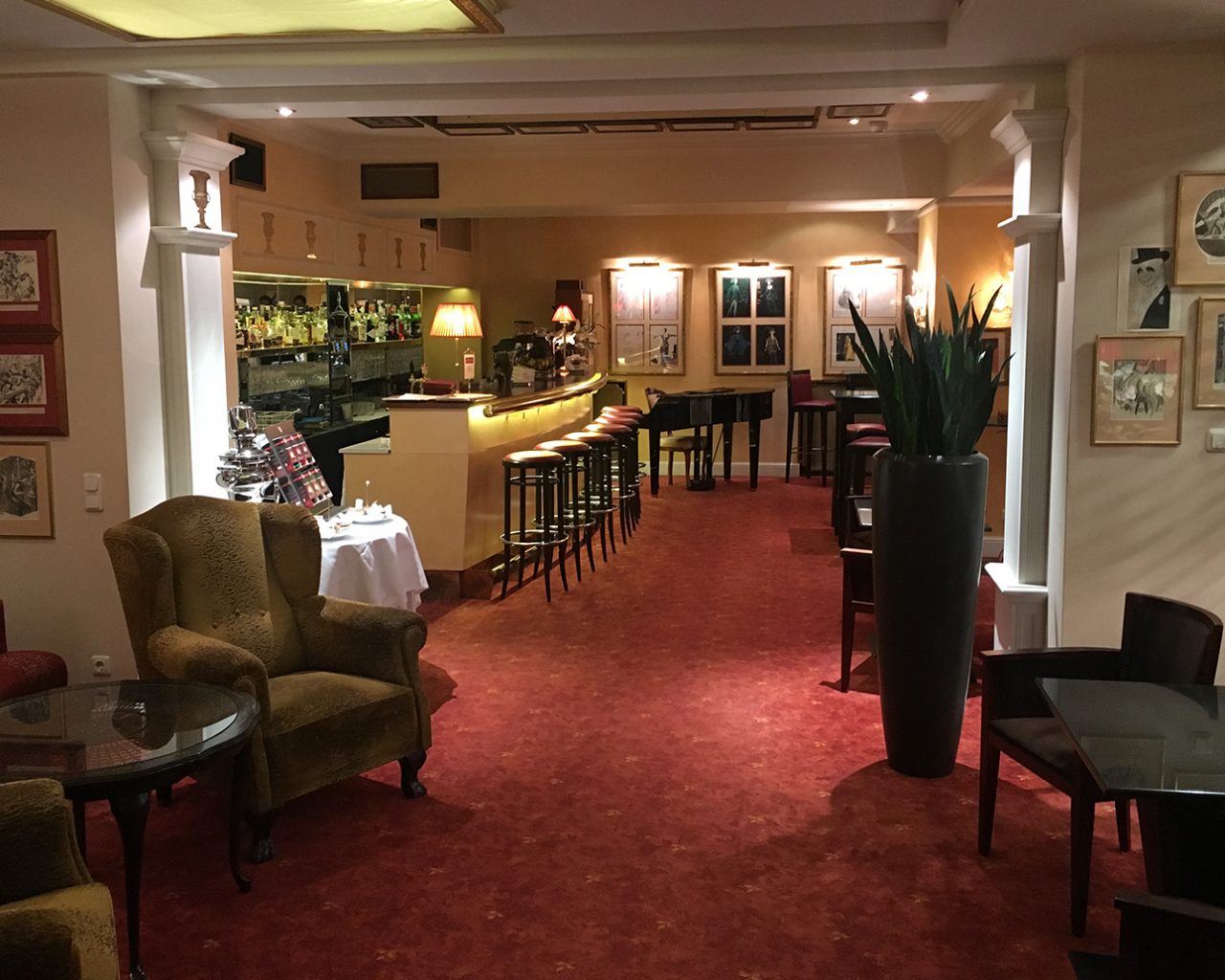 Ein bisschen fühlen wir uns in der Zeit zurückversetzt, als wir uns auf einer samtig-weichen Bank in der Sketch Bar sinken lassen. Zentral am Makartplatz gelegen, erreicht man diese besondere Hotelbar durch einen gesonderten Eingang, links neben dem eigentliche Hoteleingang. Die Sketch-Bar wurde uns von einer lieben Bar-Insiderin empfohlen, und wir stellen fest: Diese Bar ist wirklich etwas besonderes. Inmitten der dunklen Holzvertäfelungen, Bücherfronten und opulenten Möbeln fühlen wir uns fast wie in einem alten Film – so, als könnte jederzeit Sean Connery als James Bond ums Eck schlendern. Der linke Raum neben der Bar ist für die Raucher reserviert, auf der rechten Seite der Bar befindet sich ein Klavier, dem ein Musiker jeden Freitag und Samstag klassische Klänge entlockt. Wir sind pünktlich zur Happy Hour (17.00 bis 19.00 Uhr) an der Bar und bekommen alle alkoholischen Getränke zum halben Preis. Zu unseren Gin Tonics bringt uns die freundliche Bedienung auch noch ein Schüsserl mit Nüssen. Die Sketch-Bar: unser Geheimtipp!