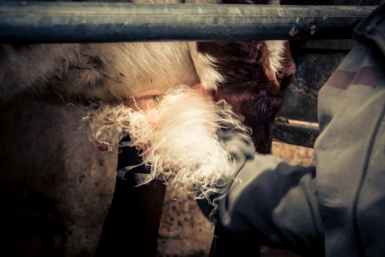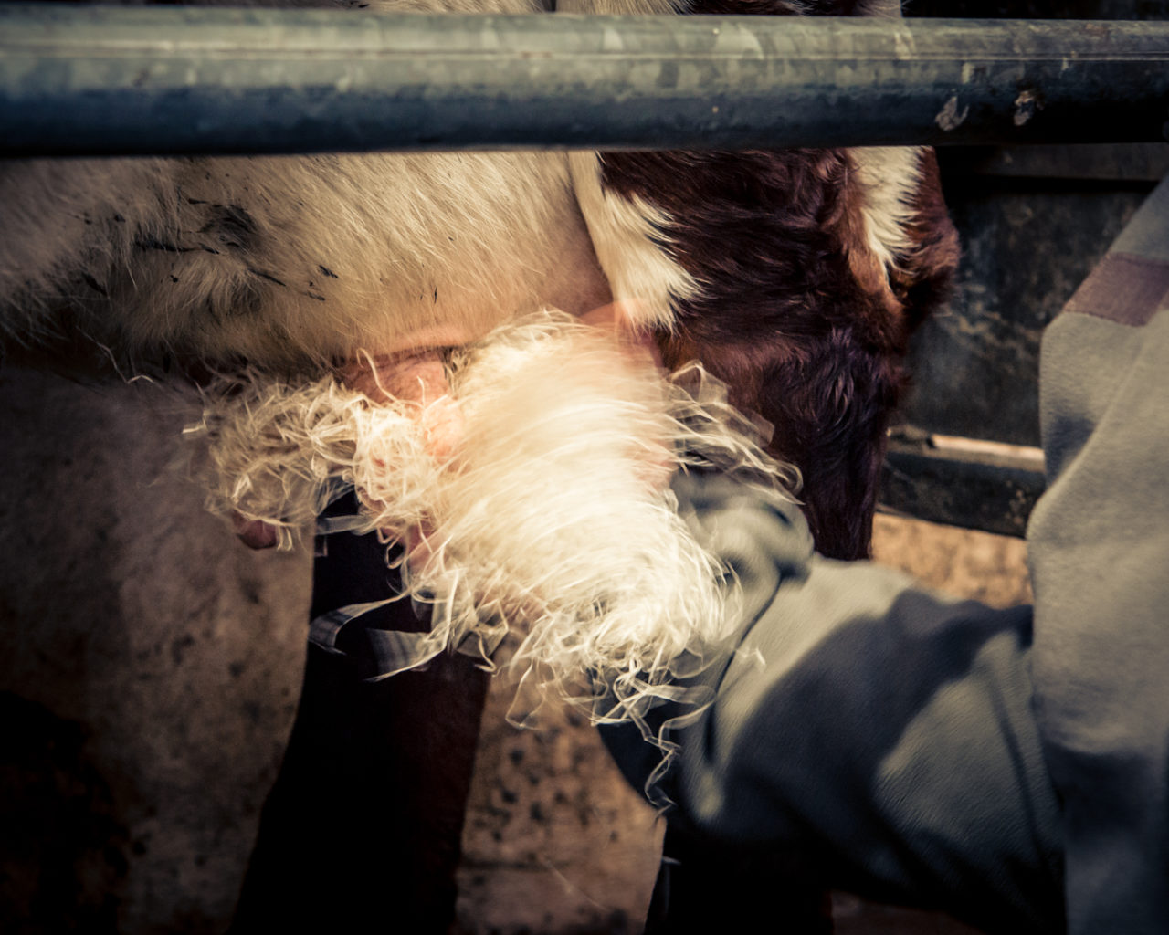 Oli und Sasch folgen Melanie in den tiefergelegten Melkstand, in dem zwei Kühe gleichzeitig gemolken werden können. Ungeduldig steht Dunkel schon vor der Schiebetür und wartet auf Einlass. „Die älteren und dominanten Kühe kommen immer als erstes in den Warteraum – den Bereich vor dem Melkstand. Sie haben auch ihre Lieblingsseite und stehen dann schon unaufgefordert vor dem Einlass des ,Durchtreibers‘. Wie bei einem Drive-in treten die Kühe auf der einen Seite ein und nach dem Melken verlassen sie den Stand auf der anderen Seite und gehen zurück in den Laufstall, wo in der Zwischenzeit ausgemistet wurde. Die Kühe wissen, dass beim Melken auch eine besondere Leckerei – geschrotetes Getreide – zur Begrüßung auf sie wartet.“ Oli füllt den Futternapf mit dem Getreide und öffnet den Melkstand. Mit zufriedenem Schnauben tritt Dunkel ein. Ein wenig misstrauisch beäugt sie Oli und Sasch anfangs durch die Holzlatten. Doch die beiden nehmen gleich Kontakt mit der erfahrenen Kuh auf und streichen ihr über die warmen Flanken und den Hals.