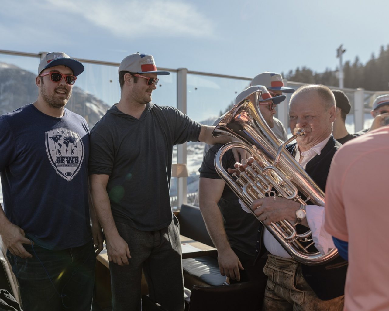 Gleich im Anschluss ging es weiter nach Flachau – und das bei richtigem Kaiserwetter. Zuerst wurden die NFL-Stars im Dampfkessel, direkt an der Talstation des Space Jet 1, kulinarisch verwöhnt, dann stand ein Meet & Greet mit den Salzburger Football-Spielern von den Salzburg Bulls, den Salzburg Ducks und den BSK Ravens am Programm, inklusive ein paar Probe-Drills direkt im Flachauer Schnee.
