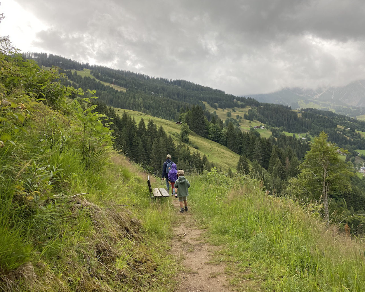 Zuerst spaziert man durch die malerischen Gasserln von Dienten, der Straße entlang. Am Ende des Ortes führt eine kurvige Straße rechts hinauf, bunte Wiesenblumen schmücken die Felder und man hat eine schöne Aussicht auf die Dorfkirche, die gegenüber erhaben über die Ortschaft wacht. Bei gutem Wetter sieht man fast bis zur Übergossenen Alm, deren Sage wir hier lauschen können. An jeder Station findet sich ein Märchenbuch, sodass man auch ohne Audio-Guide die Sagen vorlesen kann, und gegebenenfalls die ein oder andere gruseligere Stelle überspringen kann.
