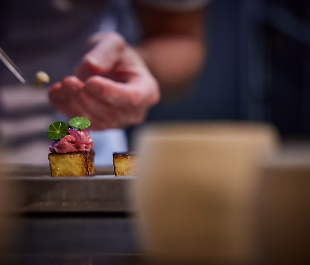 Während Daniel Reifecker sich auch abends in der Küche austobte, verließ Jakob Schmid für den Tisch-Service die Küche und kümmert sich zuvorkommend um die Gäste des Restaurants. „Ich habe während meiner Ausbildung im Esszimmer ebenfalls im Service mitgearbeitet. Auch beim Chefs Table in der Roten Wand haben wir als Köche immer direkt vor dem Gast gearbeitet. Daher ist es kein komplettes Neuland für mich“, erklärte der Spitzenkoch. „Tagsüber machen wir zu zweit das Mis en place, am Abend teilen wir es uns auf.“ Daniel ist um zehn Jahre älter und sorgt dann für das finale Finetuning in der Küche – und das beschert den Gästen wahre Gaumenfreuden. „Jakob und ich haben uns damals im Esszimmer kennengelernt und wir haben sofort gut gematched“, erzählte Daniel, der in der Stadt Salzburg aufgewachsen ist und im Stiftskeller St. Peter seine Lehre absolvierte. „Uns war klar, wenn wir etwas Eigenes aufziehen, dann gemeinsam.“
