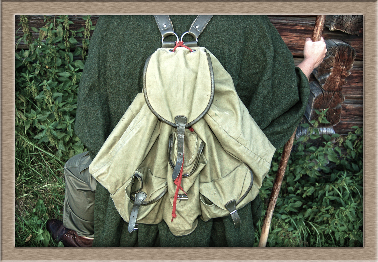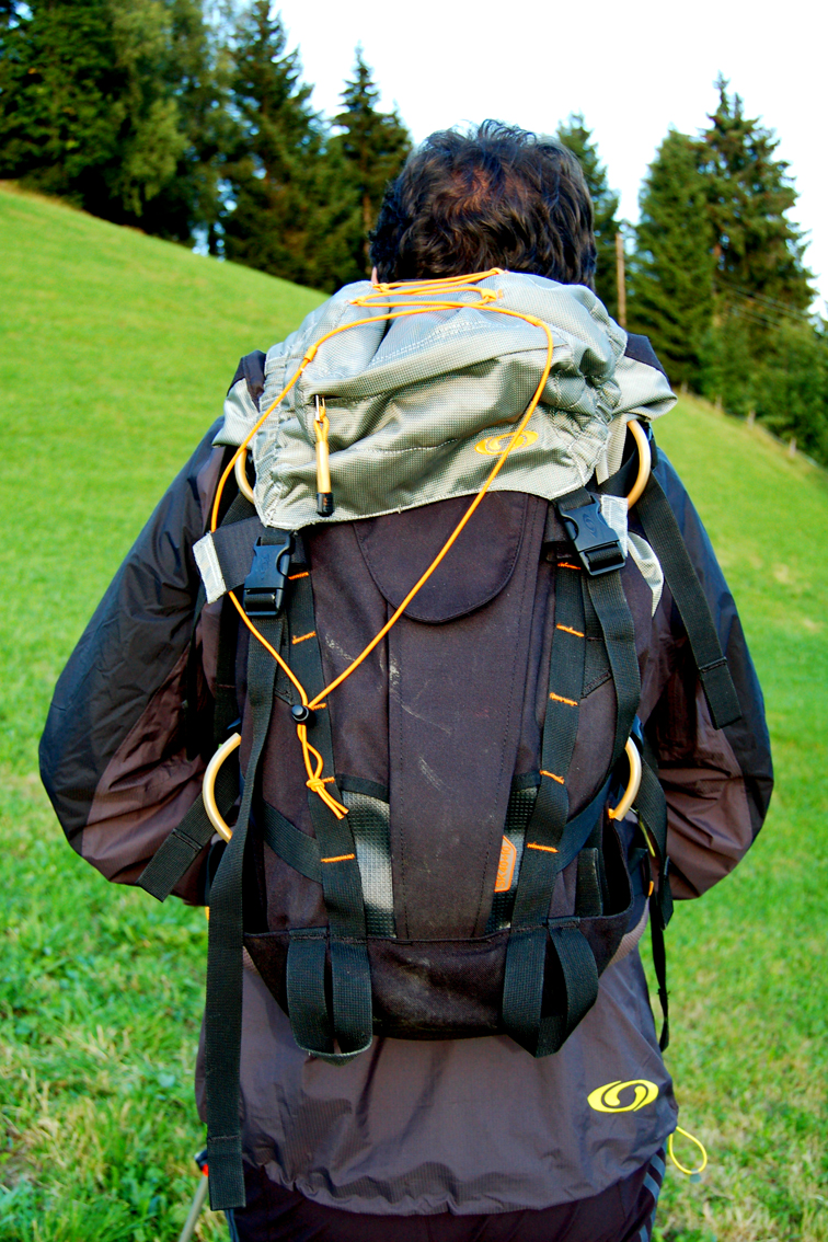 Mein Rucksack, der seinem Namen noch wirklich gerecht wird – er ist ein Sack, den ich mit zwei Lederriemen am Rücken trage, ist jetzt mit dem Umhang bereits gut gefüllt und baumelt spürbar im Kreuz. Etwas neidisch schiele ich auf Rainer, dessen Rucksack ihn fest wie eine innige Umarmung umfängt. Ein ausgeklügeltes Befestigungssystem sorgt dafür, dass jedes Wanderzubehör seinen perfekten Platz im und am Rucksack findet und die Belüftungspolster halten den Rücken trocken.
