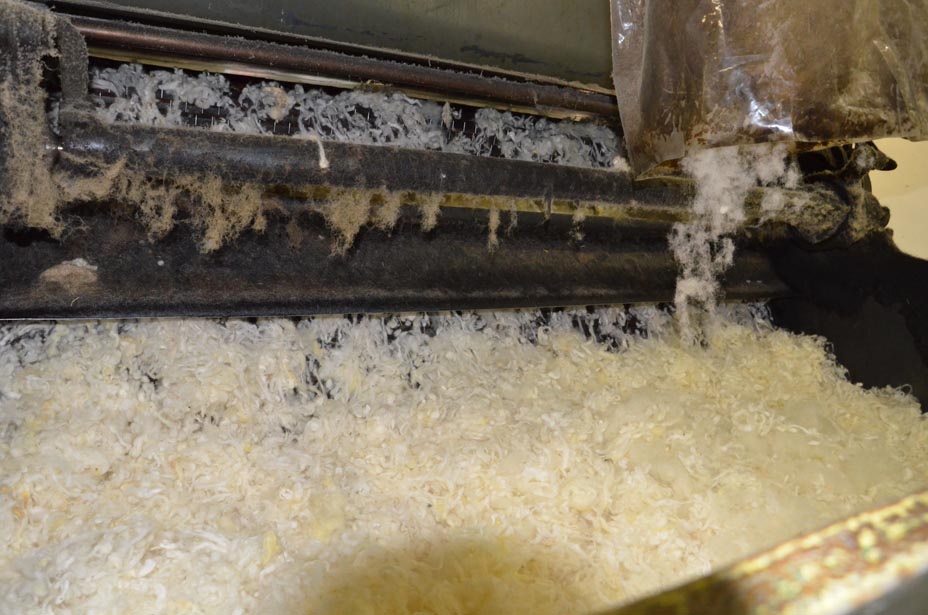 In der Nähe des Einganges stehen große Säcke – prall gefüllt mit weißer, brauner und schwarzer Rohwolle. Auch kräftige Gelb-, Orange-, Rot- und Blautöne gibt es. Huber färbt sie in speziellen Maschinen. Die gefärbte oder die naturbelassene gesäuberte Rohwolle wird, bevor sie weiterverarbeitet wird, gekämmt. Das geschieht in der Krempelmaschine. Alle Fasern werden ganz fein aufgesplittet und parallel ausgerichtet. Dieses feine Vlies rollt Huber zu Ballen. Bäuerinnen und Hobbyspinnerinnen aus der Umgebung holen sich dieses Vlies und spinnen auf dem Spinnrad feines Garn für Socken und Fäustlinge. Aus dem bunten Vlies entstehen warme Patschen, kreative Taschen und kunstvoller Schmuck.