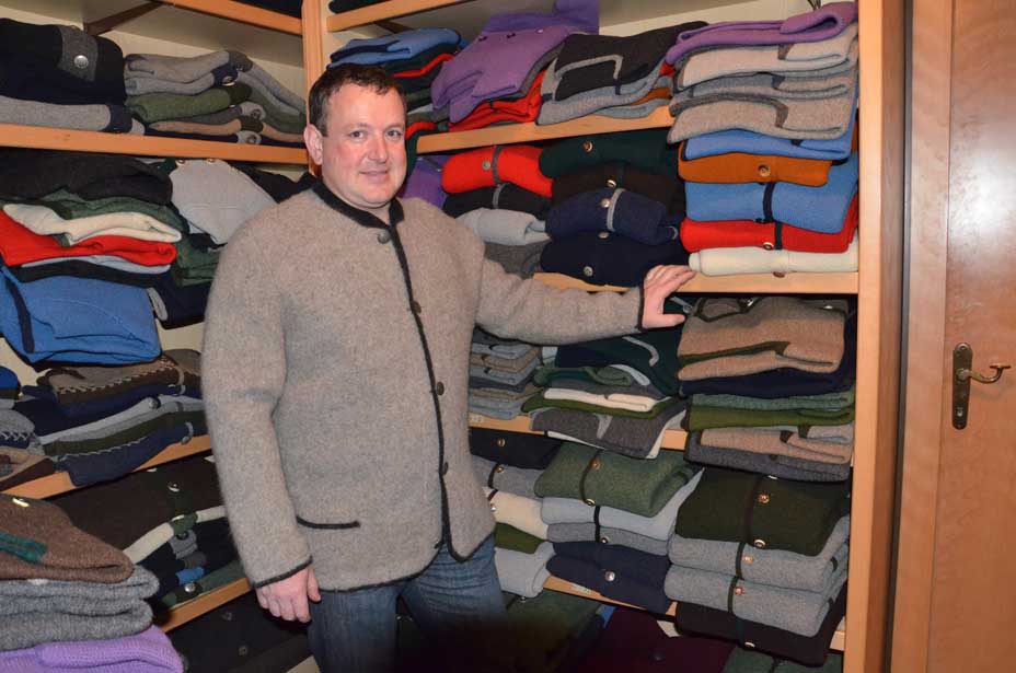 Das restliche Vlies kommt in große Fertigungsmaschinen. Da wird es zu feinen Fäden gesponnen und zu zwei- oder dreifädigem, festem Handstrickgarn verarbeitet. In Hubers Betrieb stehen vor allem alte Maschinen. „Die älteste ist 100 Jahre alt, die jüngste hat auch schon um die 30 Jahre gedient“, sagt Huber stolz. Die Wolle wird auf Strickmaschinen emsig zu Westen, Socken und Fäustlinge (Handschuhe) verarbeitet. Damit sie besonders warm sind, walkt Huber sie. Mit walken ist nicht das englische gehen, sondern das Verfilzen des Gewebes gemeint. Jacken, Fäustlinge und Socken sind um rund ein Drittel größer und werden zu heiß gewaschen. Durch den Schleuder – und Waschvorgang verfilzt die Wolle und geht um rund.40 Prozent ein. Dabei werden unzählige Luftkammern im Stoff eingeschlossen, die wie eine Schutzschicht schützt. So bleibt die Temperatur im Inneren der Fäustlinge bei Kälte und Wind nahezu konstant, da die eingeschlossenen Luftkammern wie eine Pufferzone wirken. Außerdem kann das gewalkte Stück gut die Hälfte des Eigengewichtes Wasser aufnehmen, ohne sich nass anzufühlen.