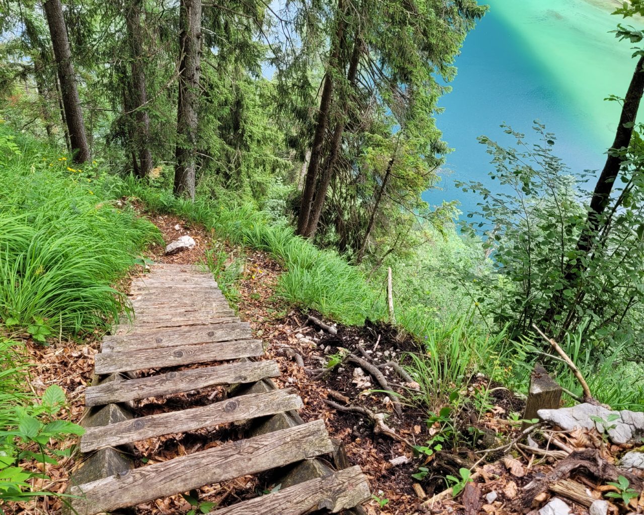 Kurz nach dem Kärlingerhaus befindet sich eine Weggabelung: Links geht es über die berüchtigte „Sausteige“ hinab zum Pilgerort St. Bartholomä, rechts über den Sagerecksteig zur Saletalm am hintersten Ufer des Königssees. Wir entscheiden uns heute für den Steig, der am schön gelegenen Grünsee vorbeiführt. Der Weg führt uns durch einen grünen „Urwald“, der uns daran erinnert, dass wir in einem Naturschutzgebiet sind, wo beispielsweise umgestürzte Bäume liegen bleiben dürfen. Es geht immer weiter steil bergab, über Holz- und Steinstufen, zum Teil mit Seil und Tritthilfen. Auch wenn wir den Königssee schon sehen, dauert es doch noch eine ganze Weile, bis wir endlich mit müden Beinen unser Ziel erreichen und direkt in den erfrischenden See springen.