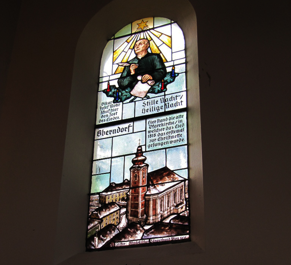 Franz Xaver Gruber war Lehrer, Mesner und Organist im benachbarten Arnsdorf. 1816 übernahm er nebenberuflich zusätzlich den Organistendienst in Oberndorf. So lernte er ein Jahr später Joseph Mohr kennen. Mohr kam ursprünglich zur Erholung nach Salzburg, nahm 1817 jedoch die freie Stelle eines Coadjutors, also als Mitarbeiter des Bischofs, in Oberndorf an. So trafen zwei begabte und gesellige Menschen aufeinander, die eine Legende schaffen sollten: Das Lied „Stille Nacht, heilige Nacht“. Der Freundschaft dieser beiden durfte es geschuldet sein, dass sie sich entschlossen, der Schiffergemeinschaft ein musikalisches Weihnachtsgeschenk zu machen. Am 24. 12. 1818 überreichte Joseph Mohr seinem Freund Franz Xaver Gruber den Text von „Stille Nacht, heilige Nacht“. Gruber vertonte den Text für zwei Solostimmen und Chor mit Gitarrenbegleitung. Die Uraufführung des Liedes, das Weltruhm erreichen sollte, fand am 25. Dezember 1818, also während der Mitternachtsmette, in der St. Nikolaus-Kirche statt. Mohr sang die Tenorstimme und begleitete auf der Gitarre, Gruber sang den Bass.