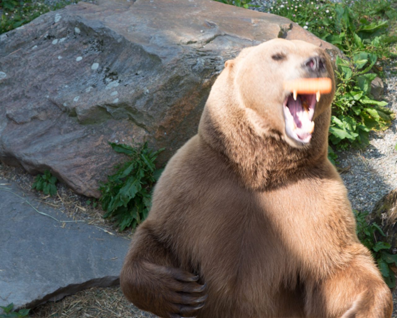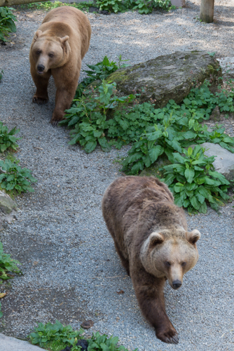Petzi und Gretl, die beiden Braunbären, die bei meinem letzten Besuch noch tief im Winterschlaf waren, kommen auf Zuruf gemächlich aus dem Schatten getrabt. Ein Raunen geht durch die Kinderschar, als sie sich zur vollen Größe aufrichten und erwartungsvoll zu den Karotten in Wolfgangs Hand heraufsehen. Geschickt fangen sie das Gemüse und während sie zufrieden schmatzen geht es für unsere Gruppe weiter, denn auch das Sikawild, die Schneeeule, die Waschbären, Fische und Schneehasen wollen gefüttert und gepflegt werden.