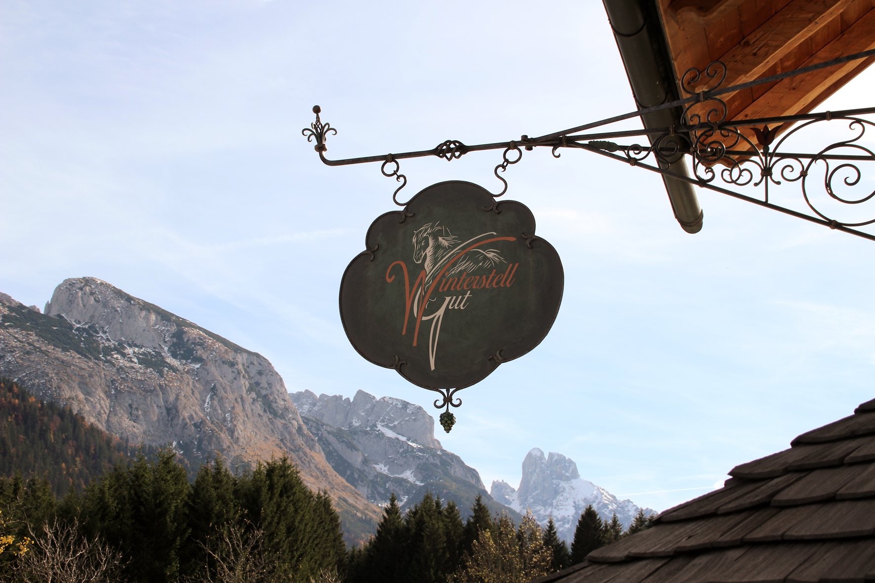 Der Name „Winterstellgut“ stammt aus dem 16. Jahrhundert, wie wir erfahren, wo das „Winterstöll“ als Winterquartier für die Tiere diente. Erst viel später wurde daraus die Jausenstation Bischofsmütze, benannt nach dem imposanten Bergmassiv im Hintergrund. Seit einigen Jahren trägt das eindrucksvolle Gehöft wieder den ursprünglichen Namen „Winterstellgut“. Und auch den Zweck von Anno dazumal erfüllt der Hof heute wieder: Im Frühling und Sommer vergnügen sich die Tiroler Haflinger aus dem Zuchtbetrieb Gut Hochreit auf den Wiesen und Weiden, im Herbst und Winter wohnen die feschen Blondinen dann in den großzügigen Ställen direkt beim Winterstellgut auf rund 1.000 Metern Seehöhe.