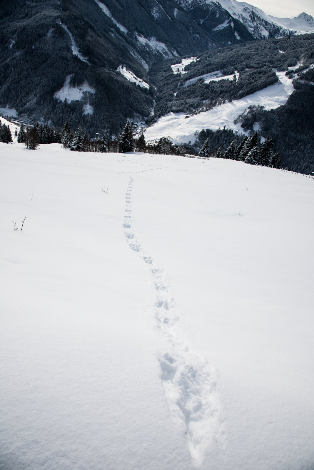 Es lohnt sich, den Blick kurz vom herrlichen Panorama des SalzburgerLandes abzuwenden und die Augen nach unten zu richten. Natürlich nicht aus Demut, sondern weil sich im frisch gefallenen Schnee spannende Geschichten ablesen lassen. Da kam er aus dem Wald, hoppelte gemütlich über das Feld und dann flüchtete er schnell wieder in den Wald hinein – der Hase. Hier die Spur eines Fuchses, oder war es doch nur der kleine Hund des Spaziergängers vor mir? Hier die Fährte eines Hirsches und was bitte sehr hinterlässt diese Spuren, die aussehen wie Pfeile?