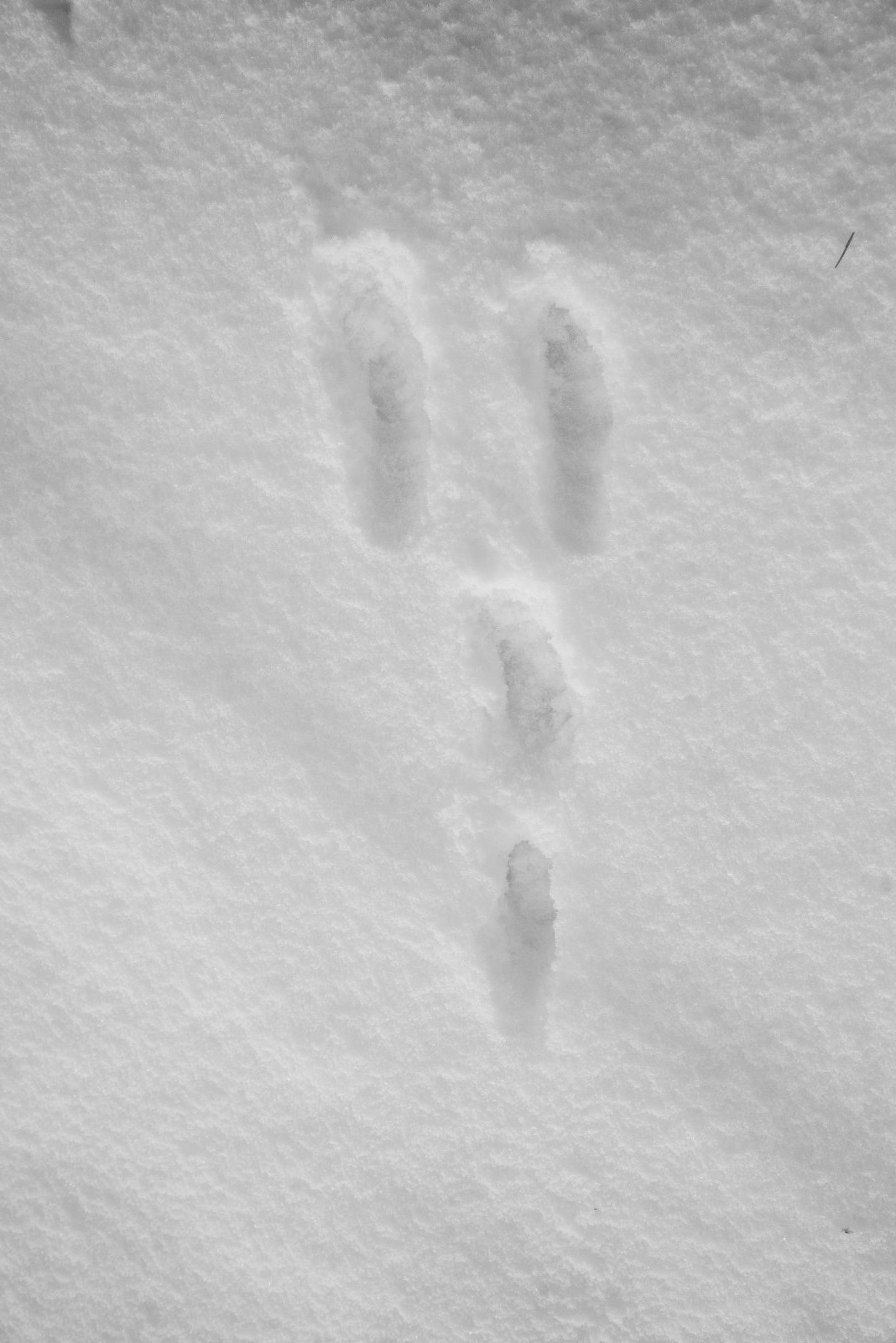 Die Hasenspur ist sehr markant – beim Hoppeln und Flüchten setzt der Hase die Hinterpfoten nebeneinander vor die hintereinander aufgesetzten Vorderpfoten. Bei einer Flucht ist der Abstand dieses „Hasensprungs“ bis zu drei Meter lang. Ähnlich platziert auch das Eichhörnchen seine kleinen Spuren, nur setzt es Vorder- und Hinterpfoten nebeneinander und die vier Zehen sind klar zu erkennen.