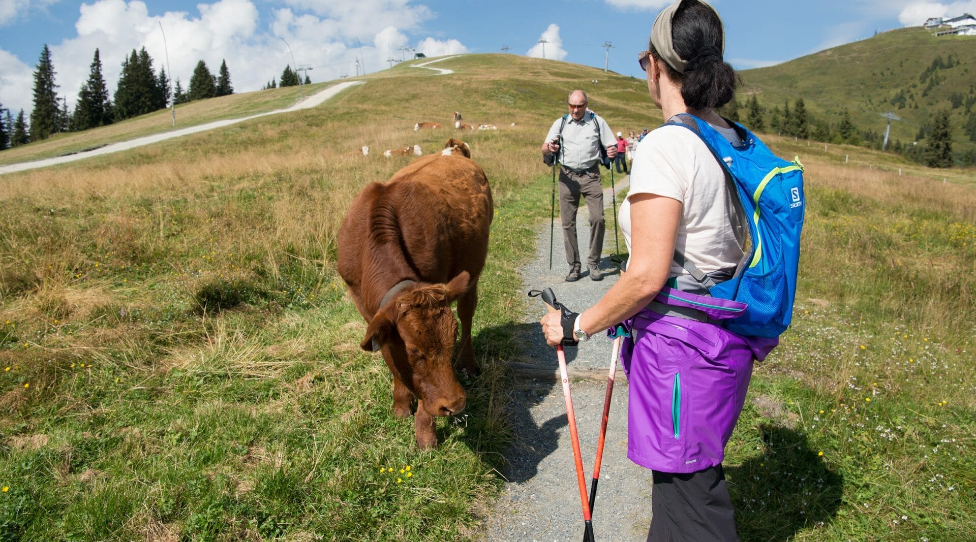 Walking downhill, I have the four lakes of the hike in front of me and each one has a different amazing intense colour. The large Lake Zell in the valley glitters like a dark green diamond. In the distance, Plettsaukopf reservoir shimmers in a soft blue, the middle reservoir seems almost turquoise and the upper lake, which we are slowly approaching, seems dark and murky. These lakes, embedded in this wonderful scenery, however, are not only here to please the summer guests. In winter they also fulfil an important function – the pump system for the snow machines taps onto these reservoirs that are filled with rain and meltwater. “Artificial snow is made up of this pure water and air and nothing else,” Resi explains. After a quick break at the first lake, where Resi gives us some information on mountain and medicinal herbs growing all around the pastures, we continue our hike downhill. We admire the “Die Zelle am Wasser” at the middle reservoir where artists in general have let their imagination run free around this idyllic lake. One work of art follows another and amazed we go from sculpture to sculpture, just like in an urban gallery. In the meantime, the sun has reached its highest point and I can only silence the whining voice of cosiness with great difficulty when it announces, “So much water, I want to go swimming!” We walk past cows grazing peacefully, who are obviously enjoying their summer in the alpine pasture up here, and head for the penultimate stage.