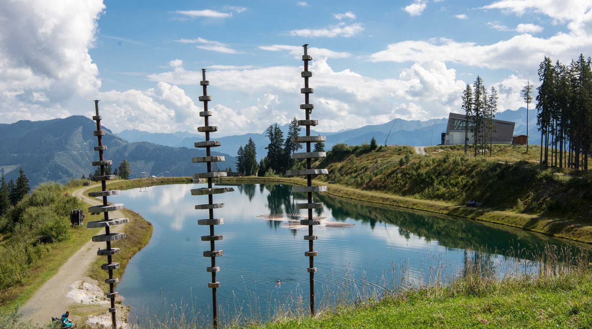 A fabulous summer’s day! “Perfect for relaxing at the lake. Simply leave all your cares behind and if it gets too hot, just leap into the glass-clear lake water,” the voice of cosiness whispers from my right shoulder. “No you don’t. It’s a perfect day for hiking! Exercise is good for you and the endless view will be reward enough for the distance covered,” the voice from my left shoulder protests. I laugh and shrug my shoulders, shaking both of them off. I’ve already decided. I am going to make both of them happy, not least me! Today I’m going on the “4 Lakes Art Hike” on the Schmittenhöhe mountain in Zell am See. I’ve got my hiking boots on and my backpack is full of snacks and a bikini. As the name suggests, this is a free weekly guided hike from the summit of Schmitten along the picturesque reservoirs down into the valley.