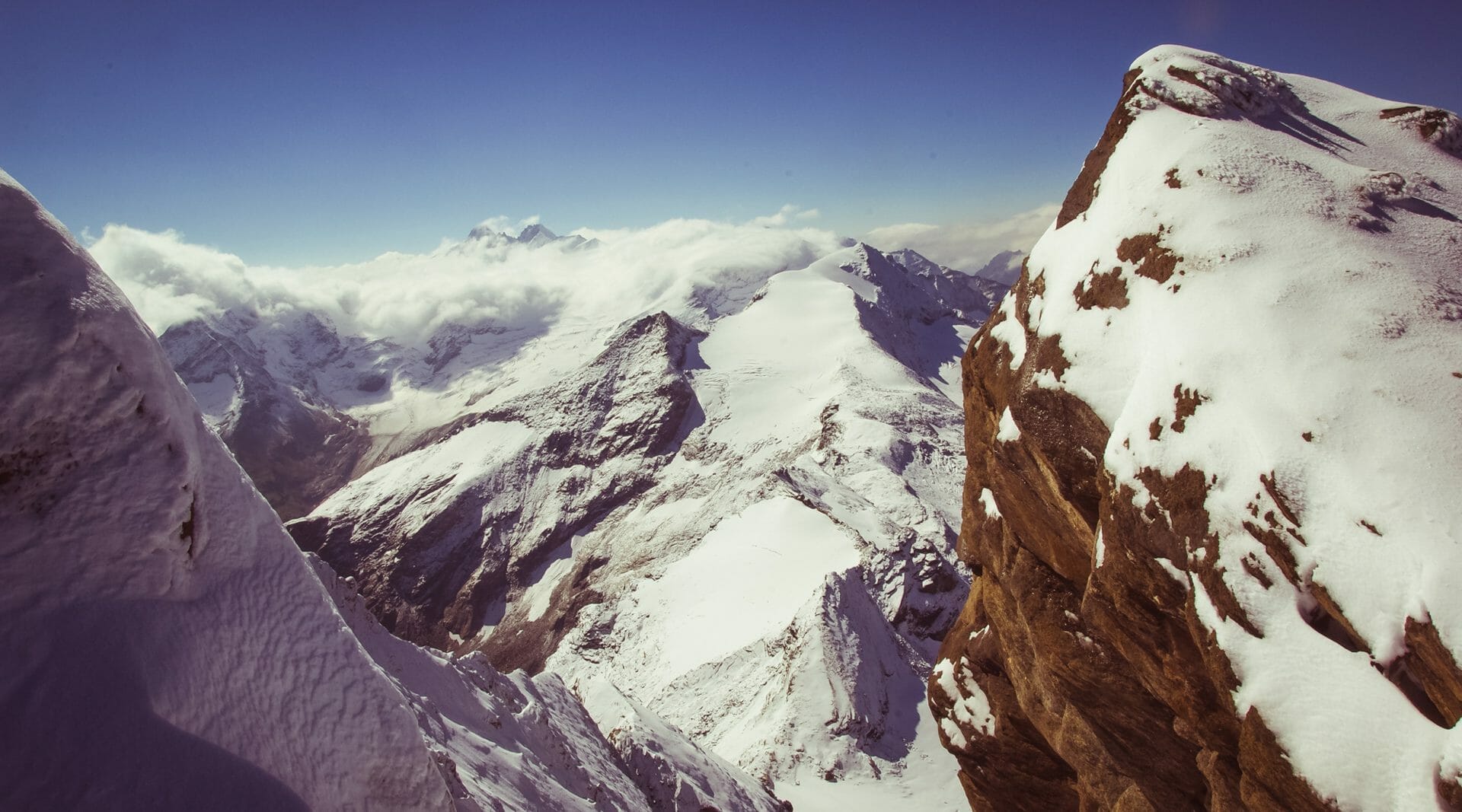 I am trudging through deep snow today where dry rock and stones dominated the route of my last ascent. Thanks to the fresh snow, this summit climb will be a new experience for me as only the footprints of my mountain guide in front of me show me the way. The cable safety devices are covered with thick rime from frost and moisture. I observe the artistic formation of the ice crystals during a break on the way up. It amazes me each time to see how water in all its different forms can be turned into such creative forms.