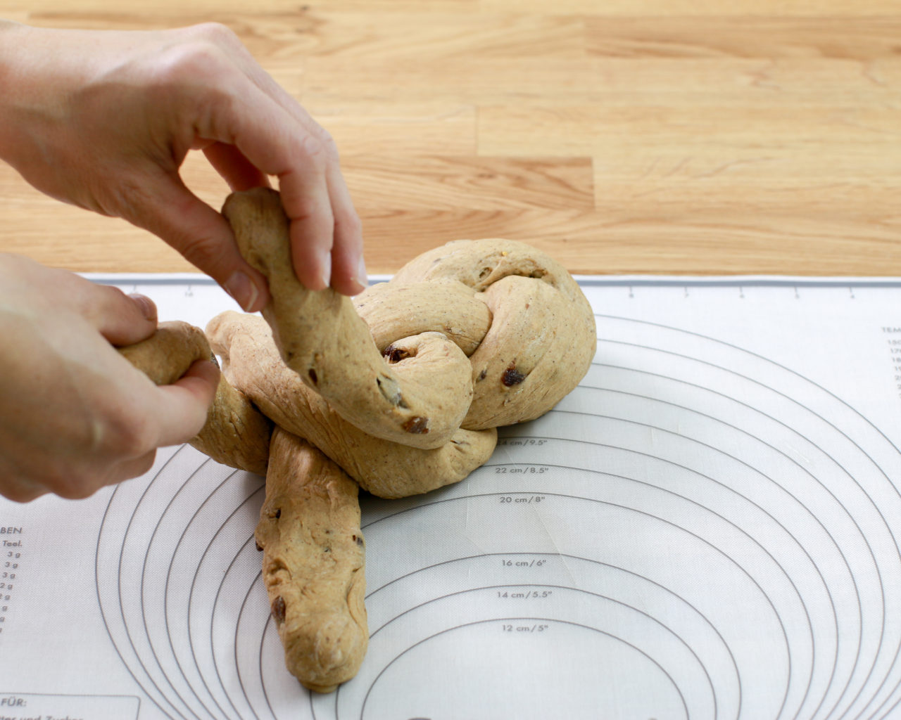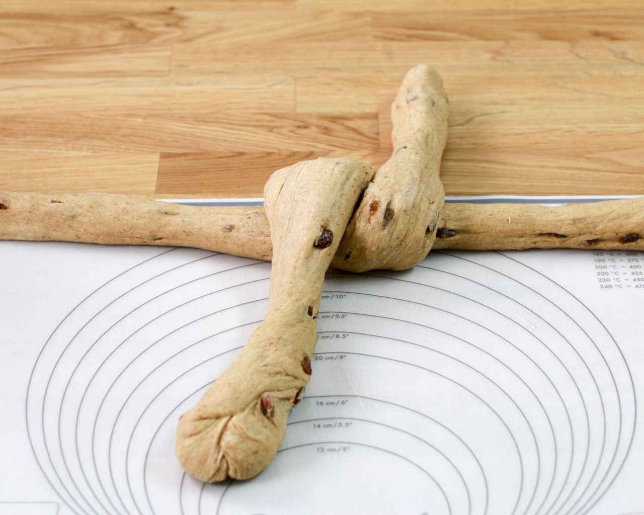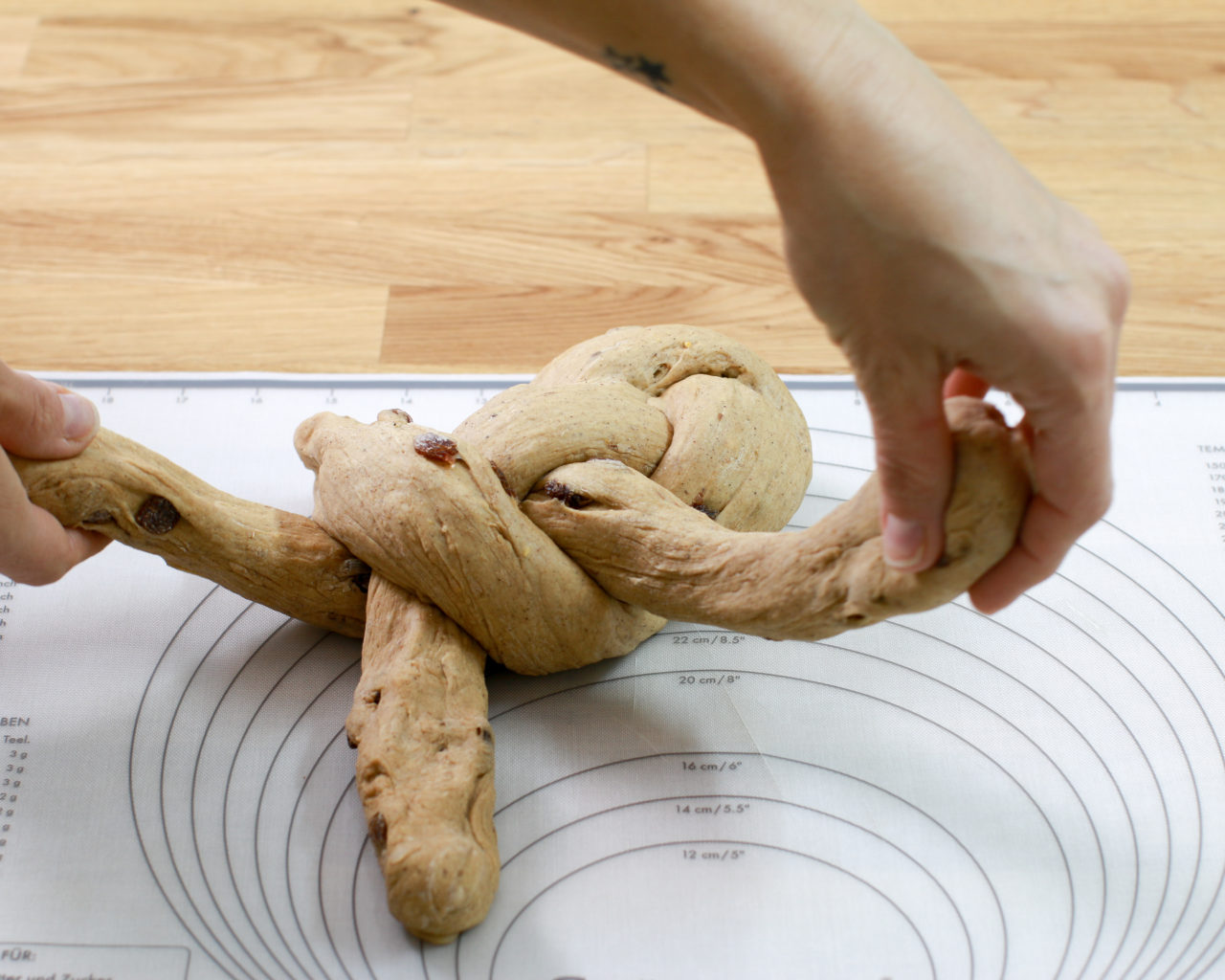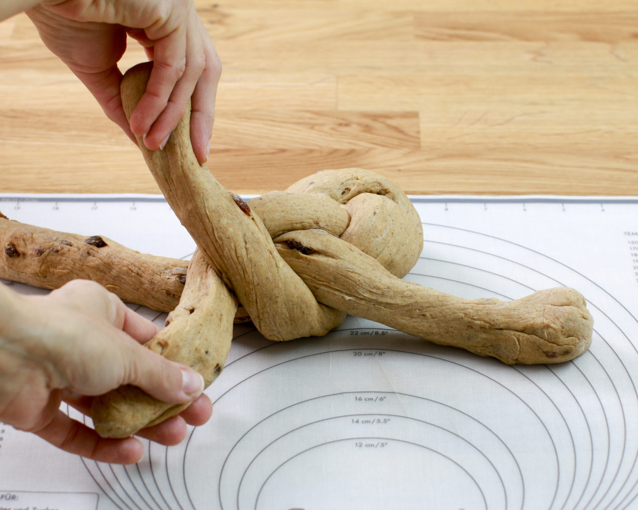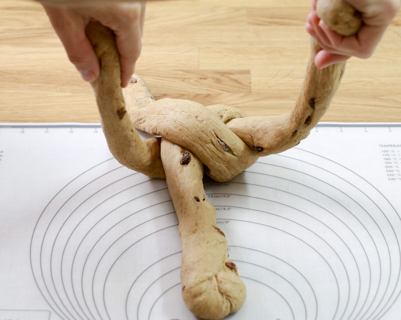 - W ostatnim kroku skrzyżuj oba końce ciasta i schowaj pod spodem.