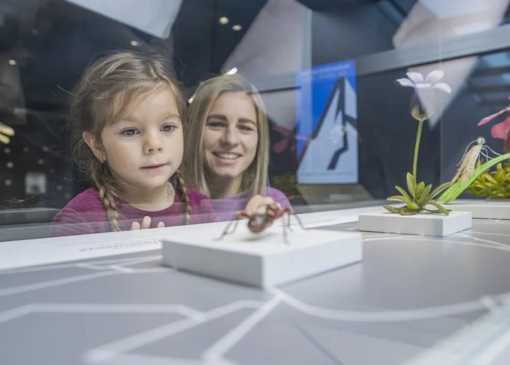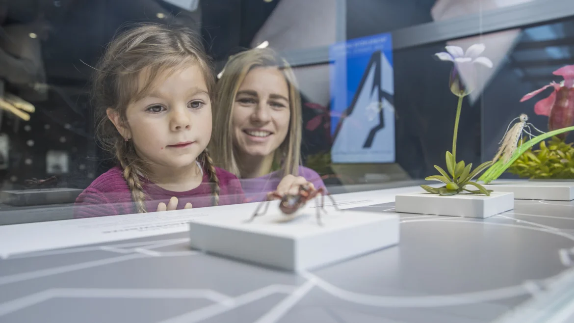 Młoda dziewczyna i kobieta uśmiechają się podczas oglądania owadów na wystawie Centrum Parku Narodowego Wysokich Taurów.
