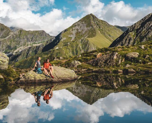 Chwila odpoczynku podczas wędrówki na hali Biberalm z widokiem na zielone góry dolin Gasteinertal © Gasteinertal Tourismu GmbH, Christoph Oberschneider
